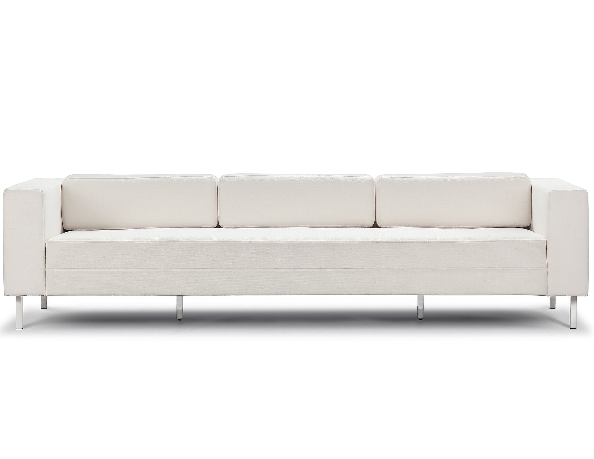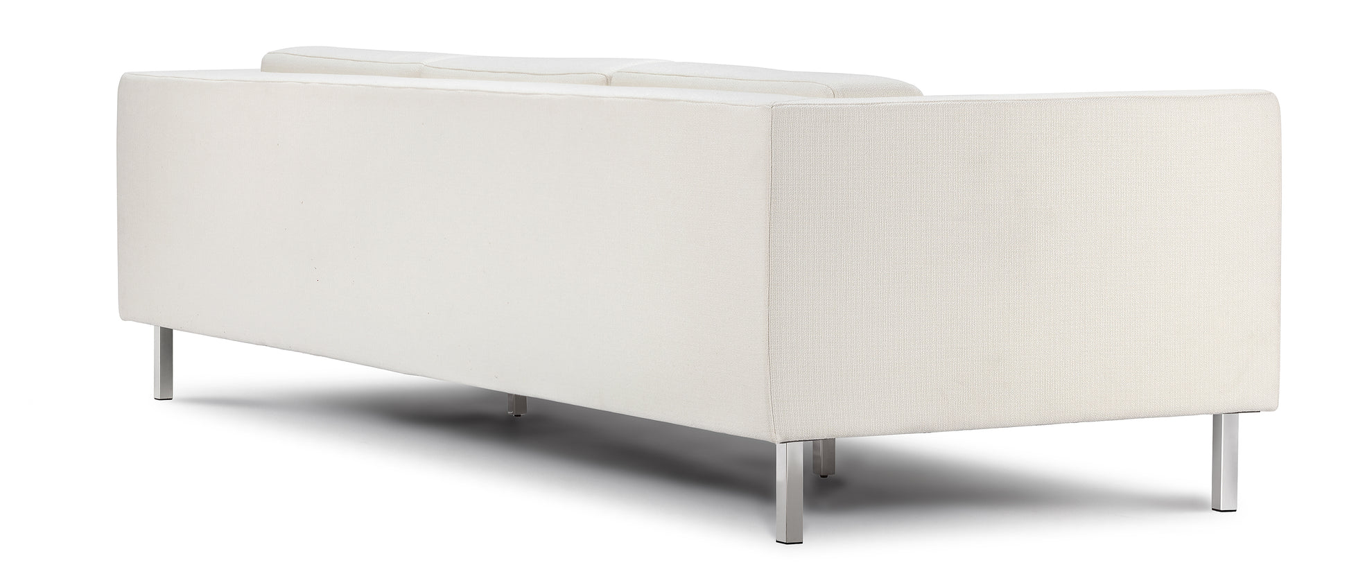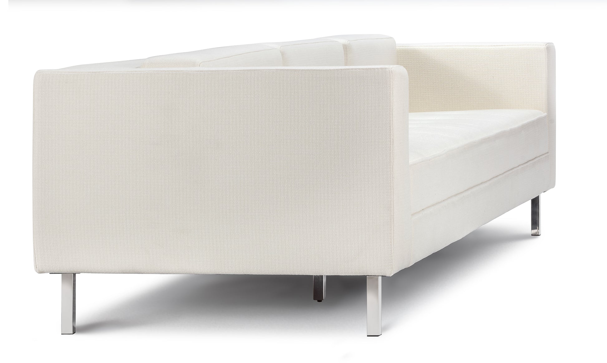 A mid-century, rectangular sofa upholstered in tweed fabric. Tufted, plush cushions create a subtle yet thoughtful accent to the design. The polished legs add a modern touch that transports the couch to the current day.