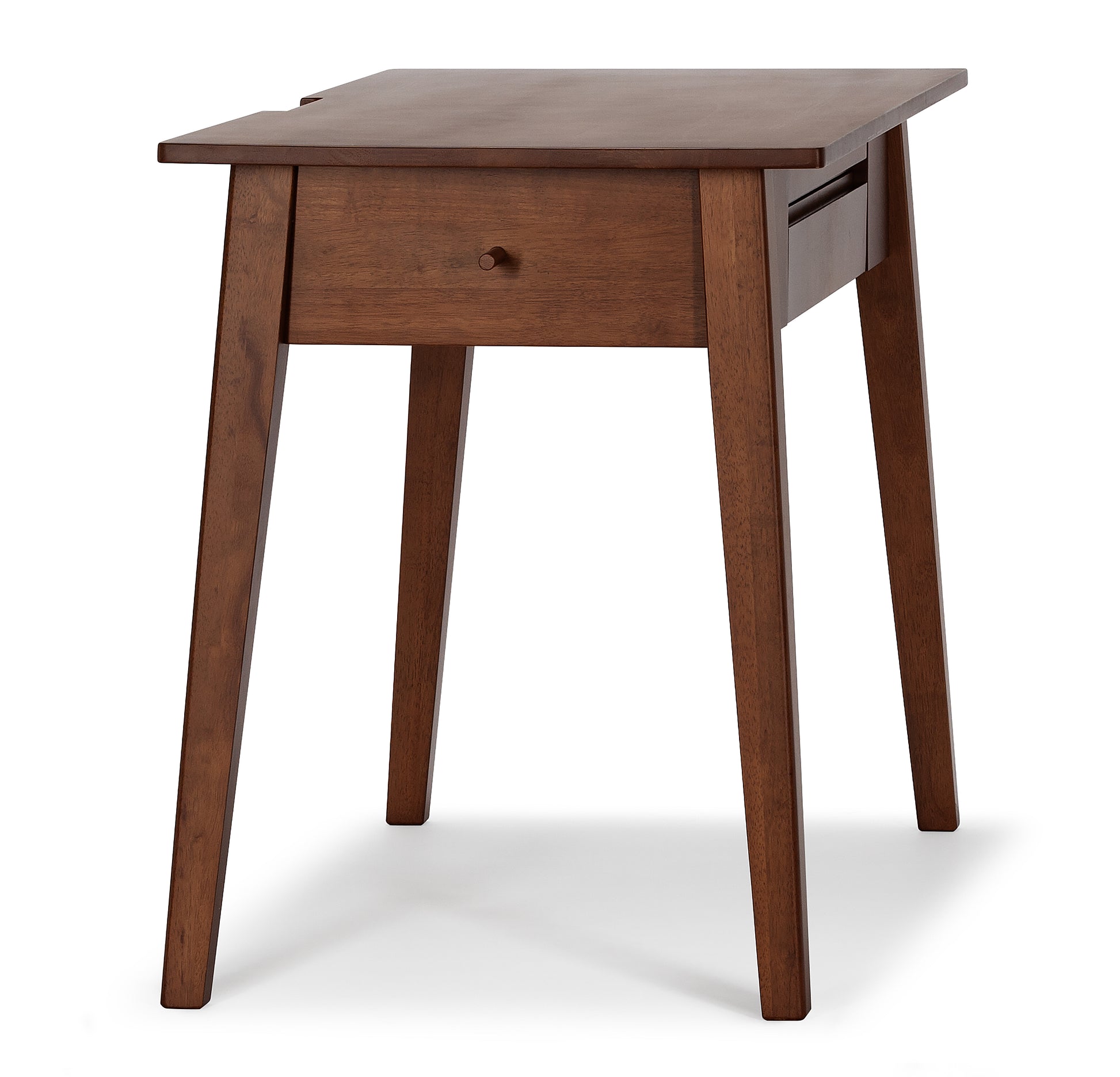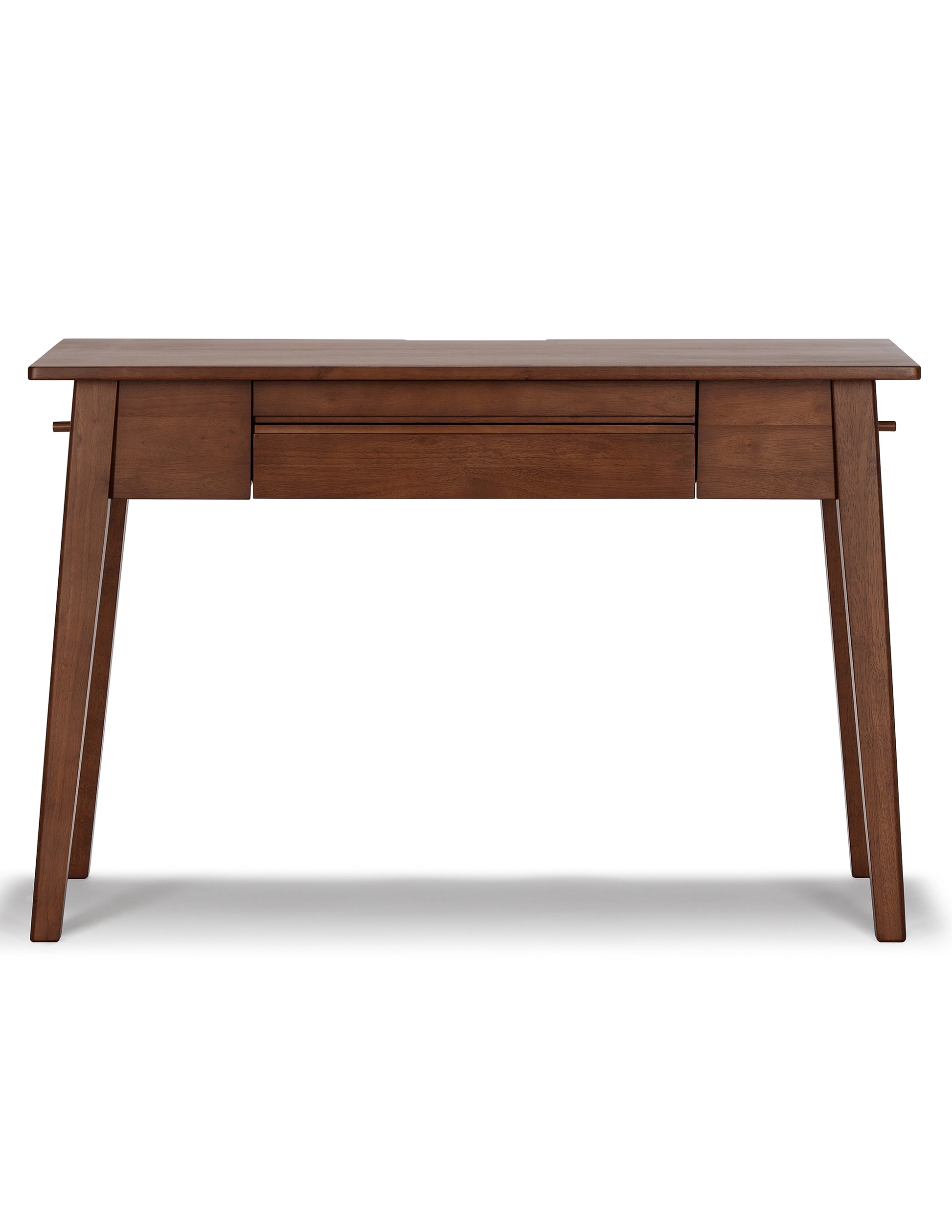 With its open concept design and clean aesthetic, the desk's understated design features a natural, dark brown wood finish that complements the simple, angular contours. The drawers and the space for computer cables make this desk even more unique.