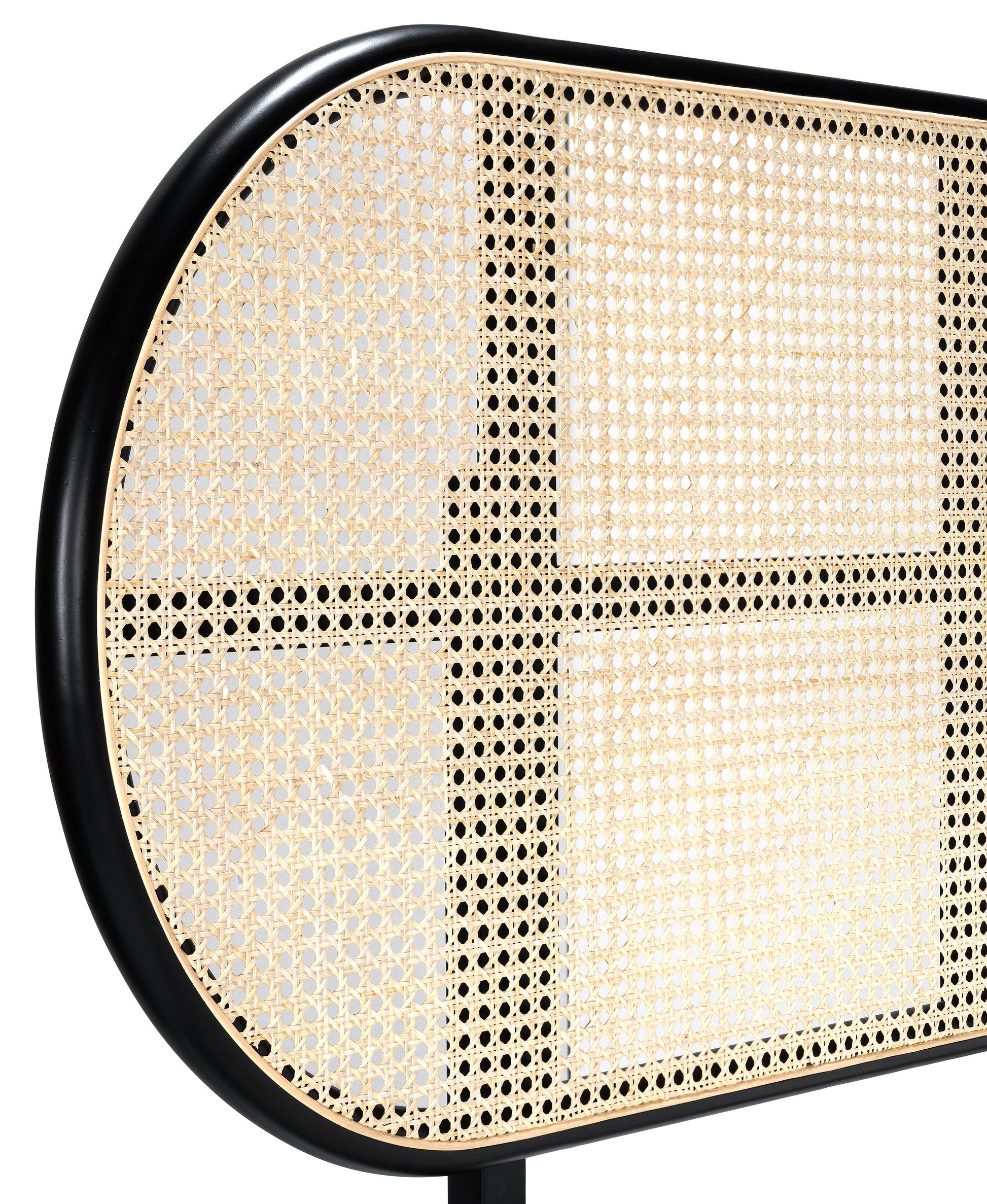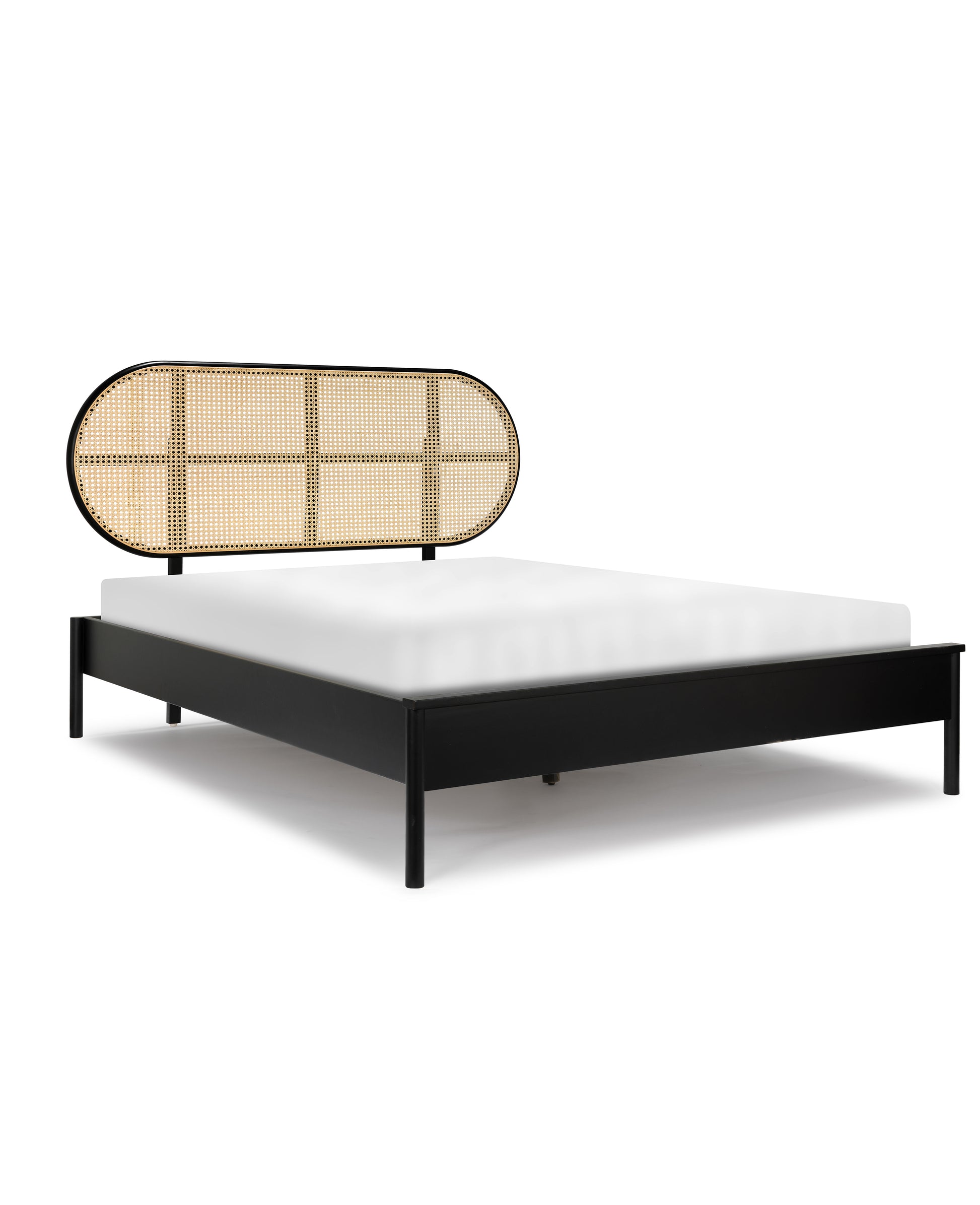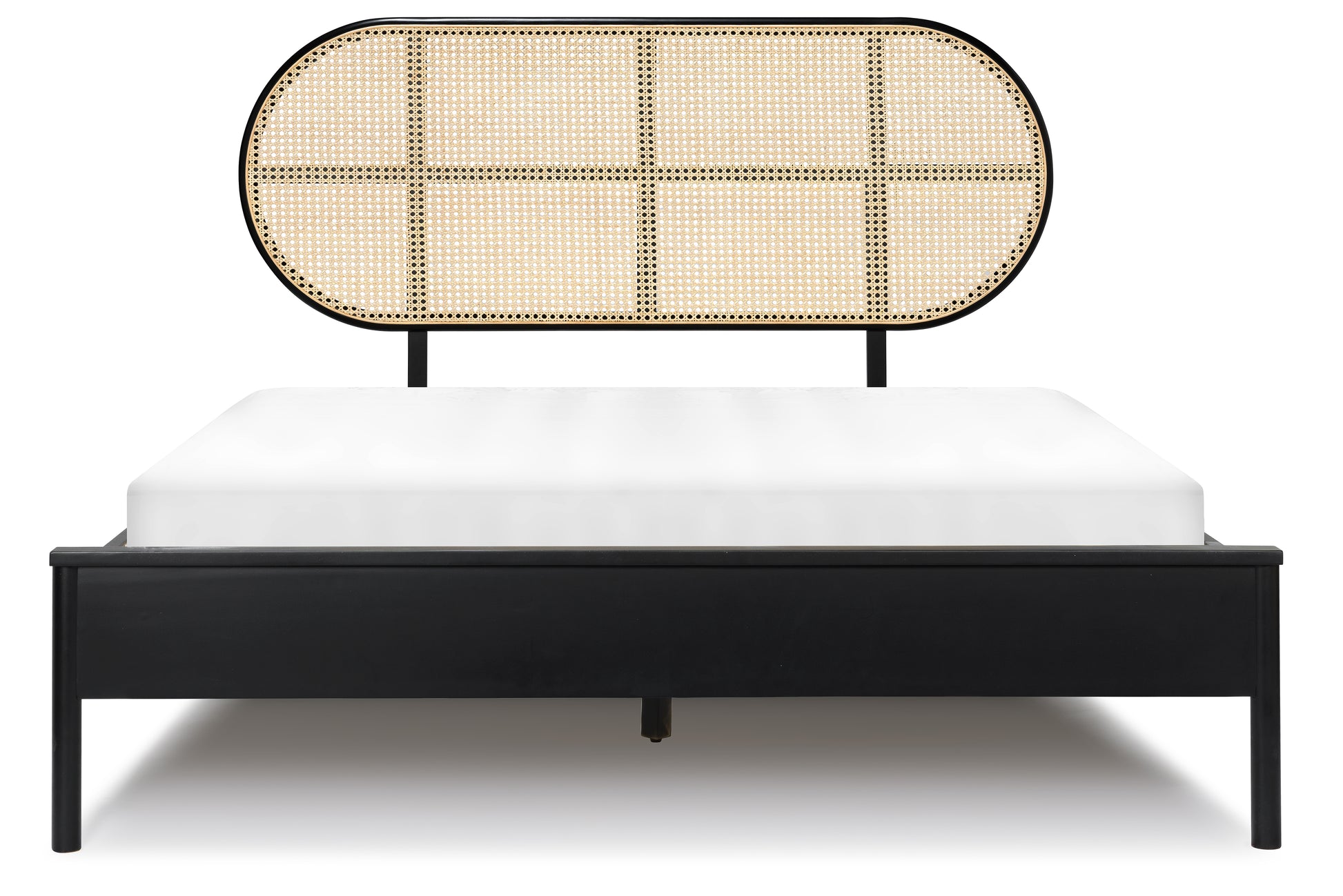 This lovely black queen bedframe is what you're missing for your aesthetically pleasing bedroom. It has a unique long neutral colored oval shaped rattan headboard that feels and looks very luxurious with an astonishing matte finished look.