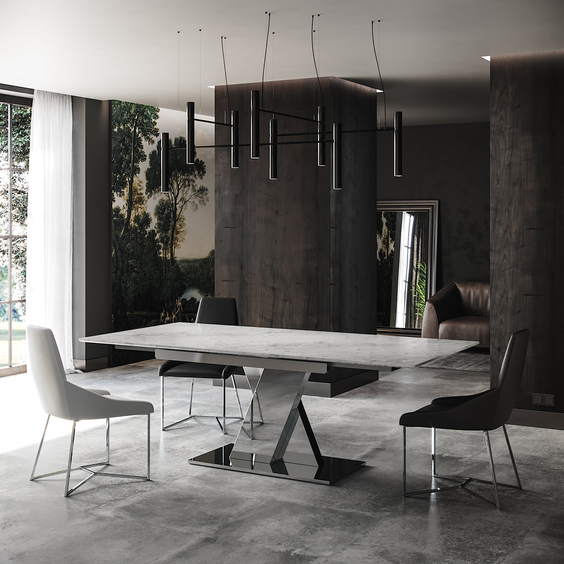 White Italian Carrara marble top over a beautifully polished polished steel base. A contemporary style table perfect any modern dining area. The marble top can also be extended to make the table longer. An overall clean design with versatile features.