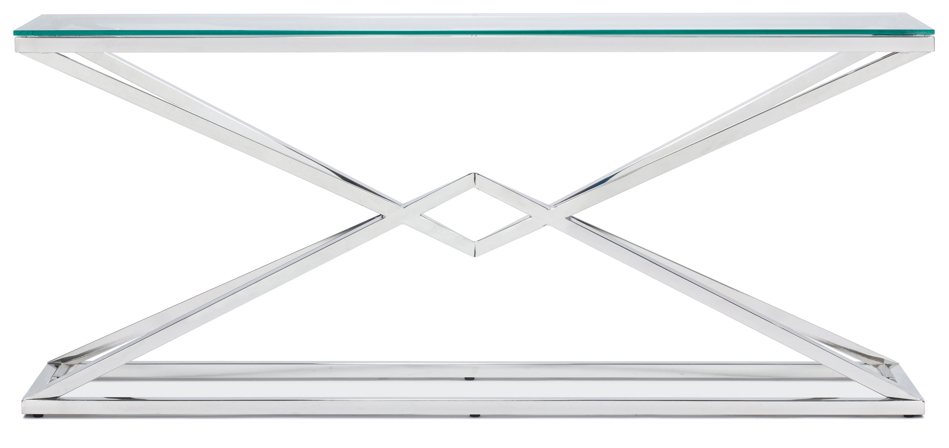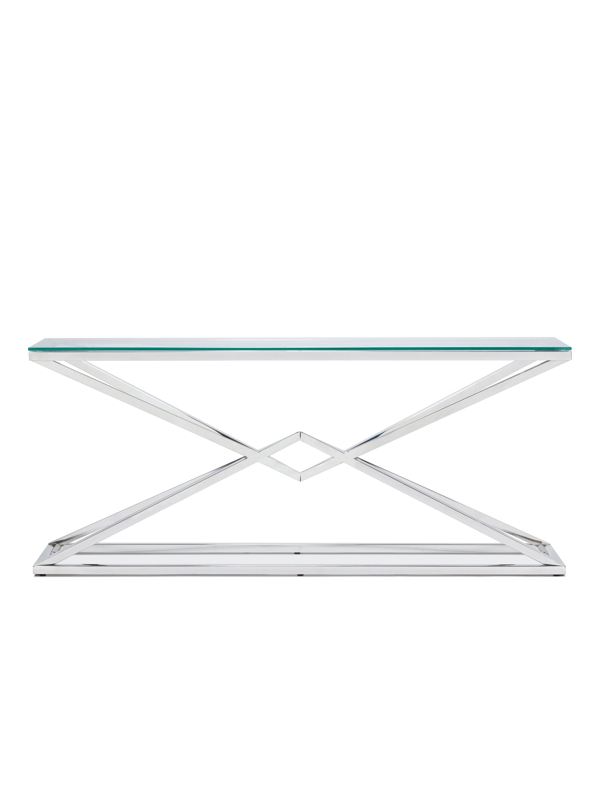 This modern pyramid structured Console Table with the perfect squared design. It features a polished steel body with two overlapping pyramid designs that connect at the center. The top is made from clear glass which compliments perfectly the metallic body at the bottom.