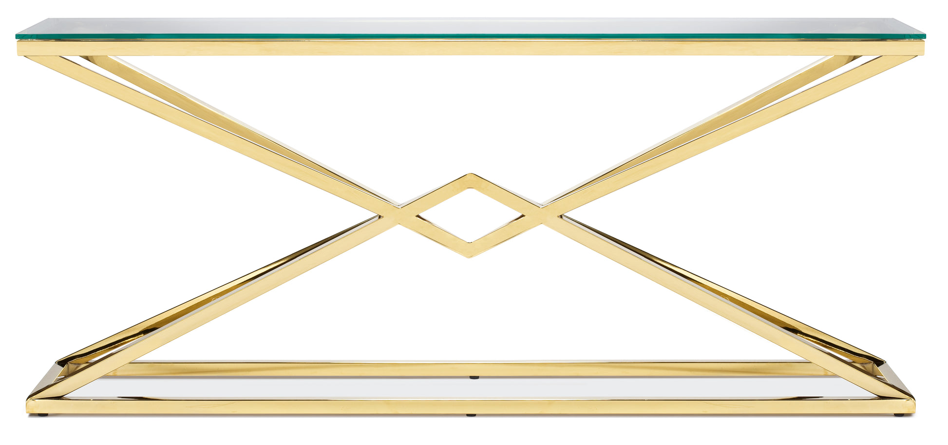 This modern pyramid structured Console Table with the perfect squared design. It features a polished steel body with two overlapping pyramid designs that connect at the center. The top is made from clear glass which compliments perfectly the metallic body at the bottom.