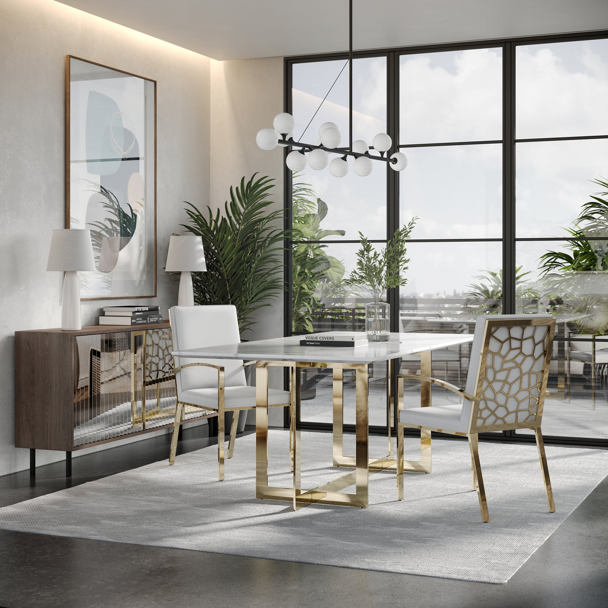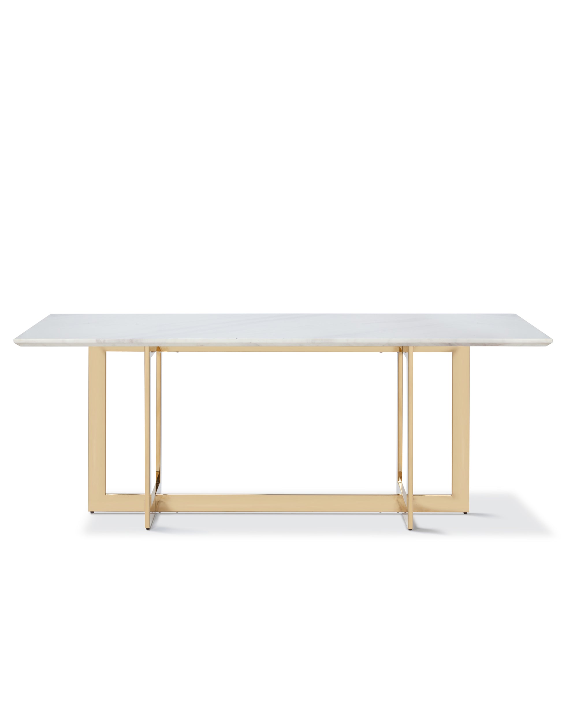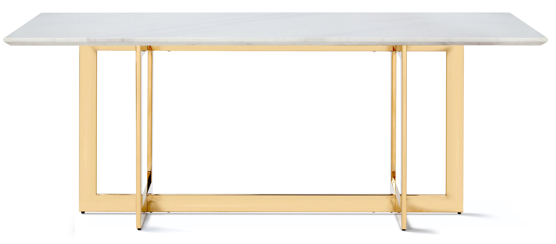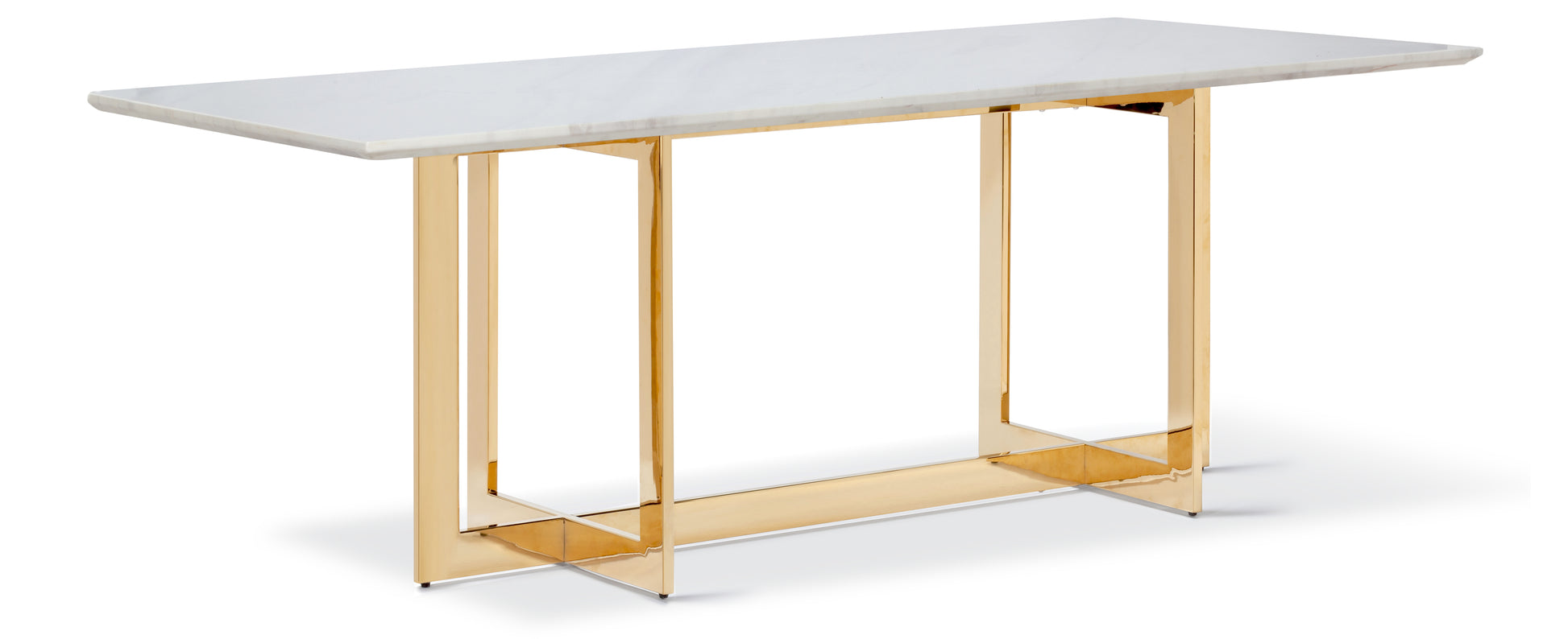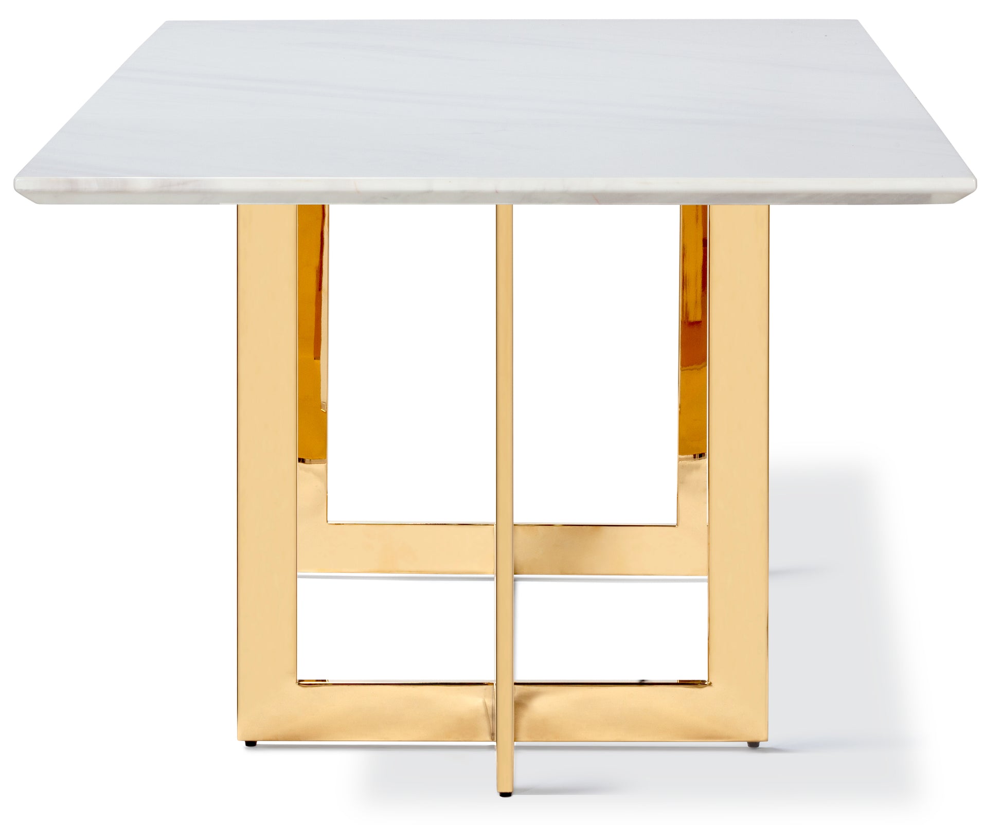 A clean polished steel base with elegant marble top. Featuring a unique design on the gold steel base, this dining table provides a contemporary look to any dining space.