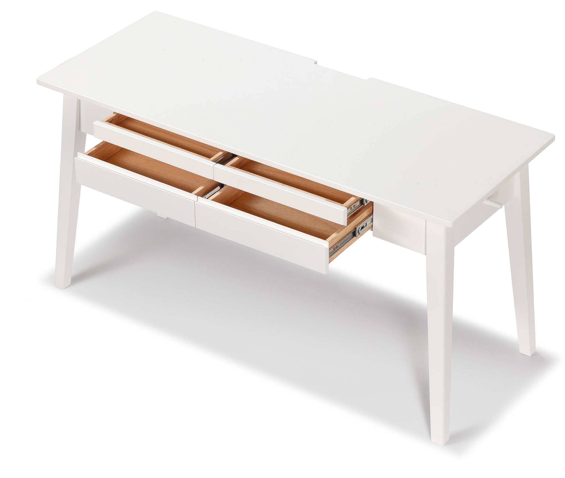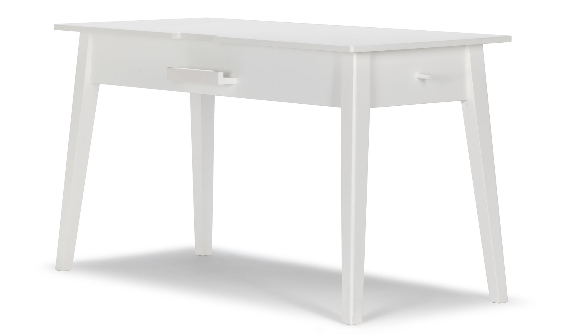 With its open concept design and clean aesthetic, the desks understated design features white wood finish that complements the simple, angular contours. The drawers and the space for computer cables make this desk even more unique.