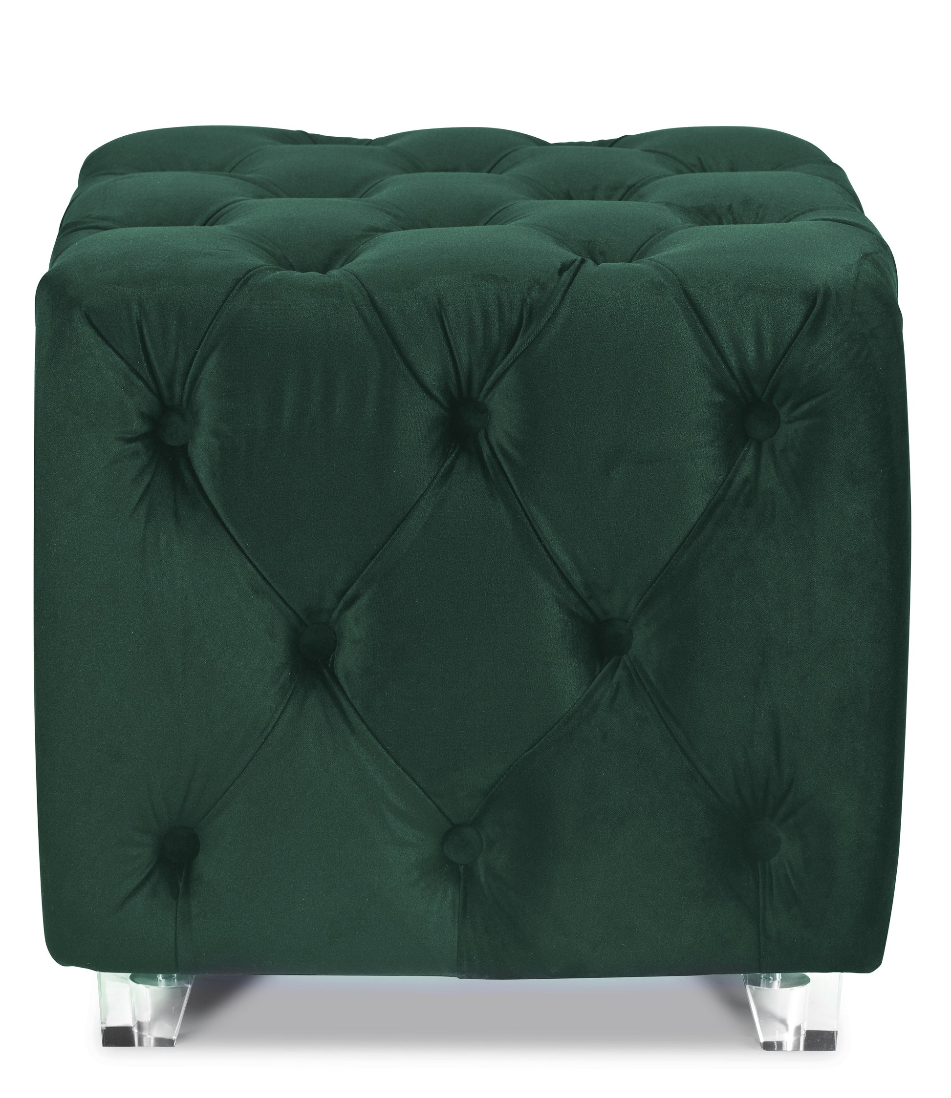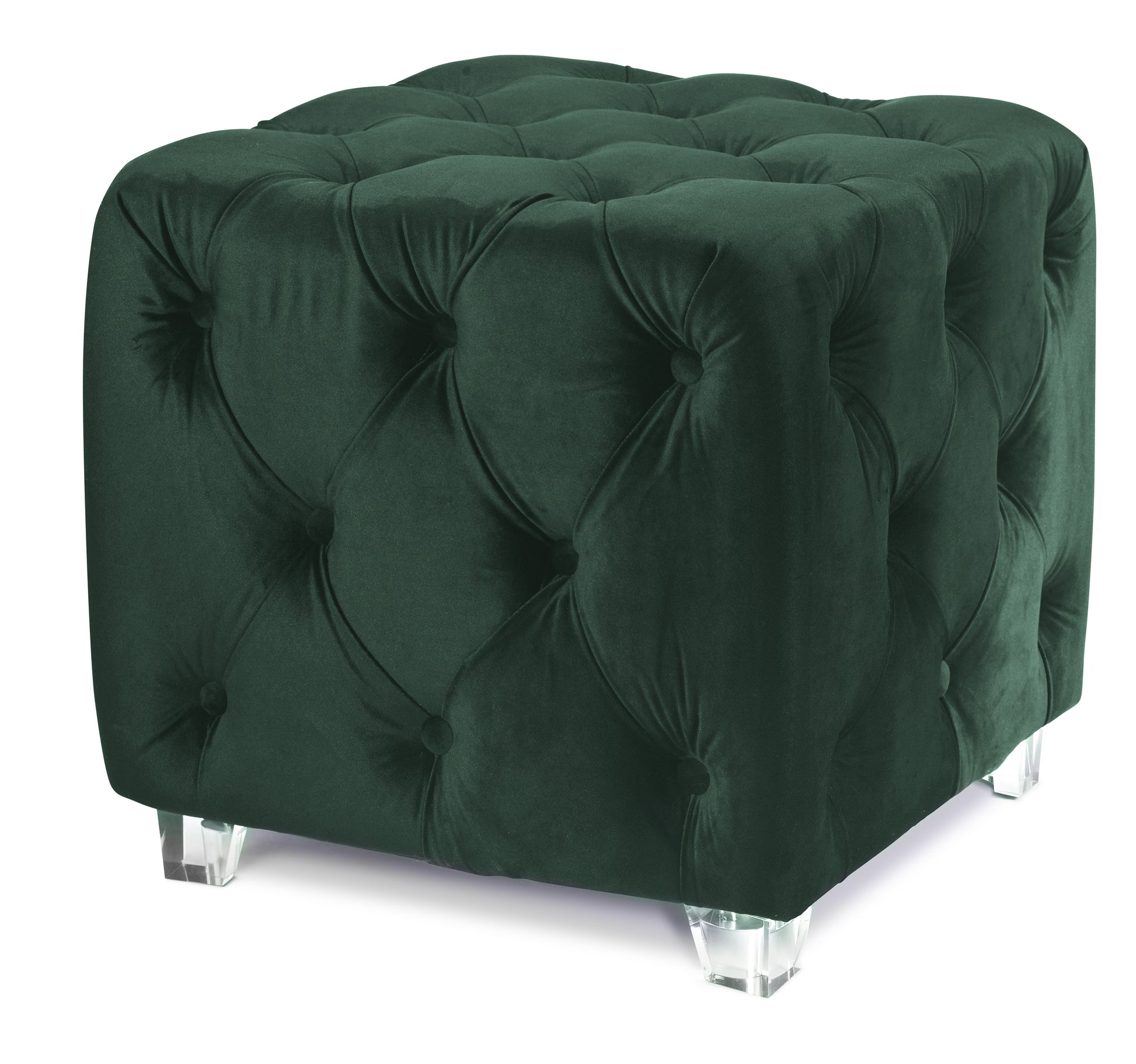 Contemporary ottoman, tufted throughout the entire body. The fabric is a soft velvet and the buttons blend perfectly into the design. The legs are made from a high quality acrylic. This design is an overall great accent to any living space and provides the support you look for.