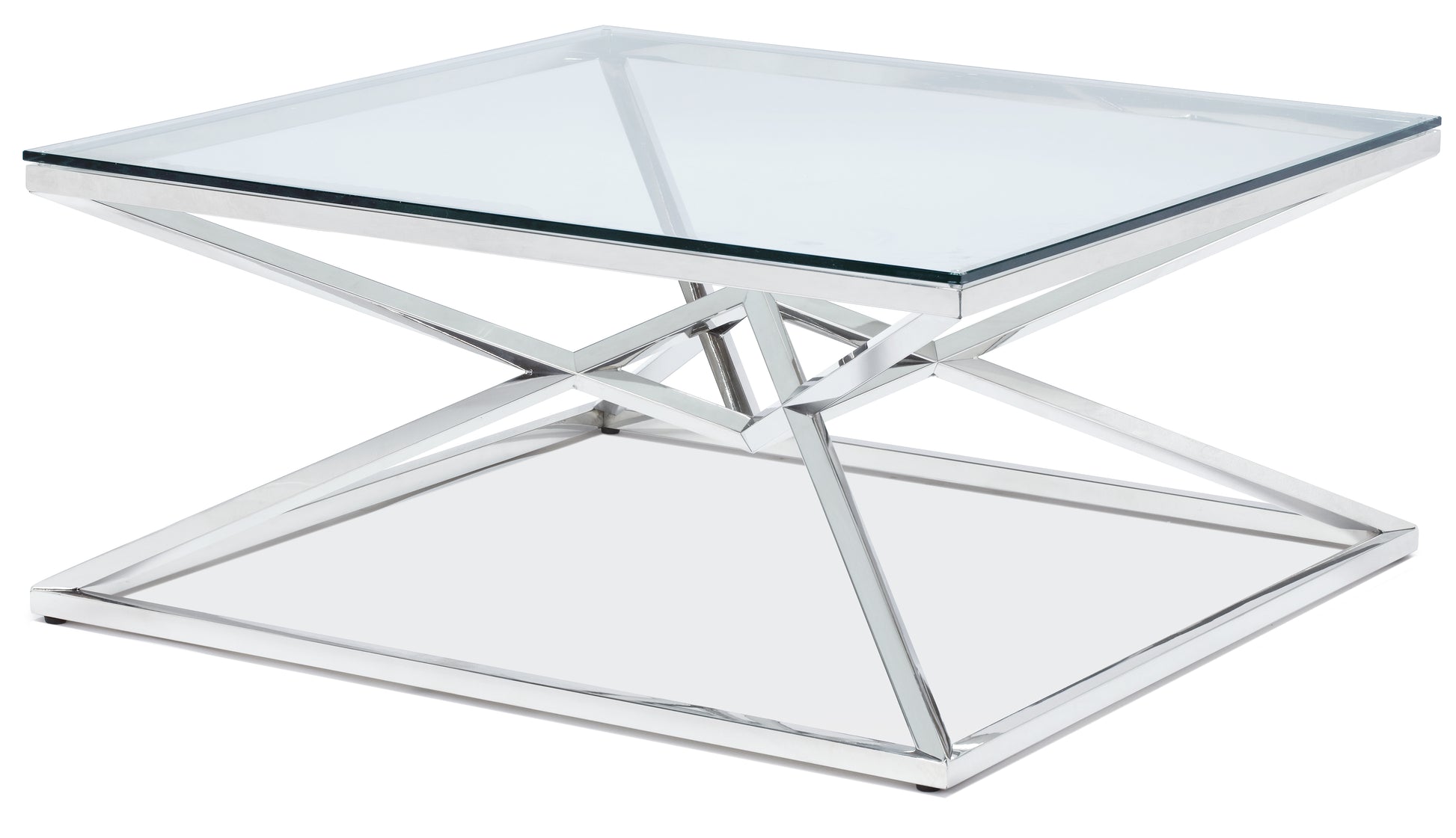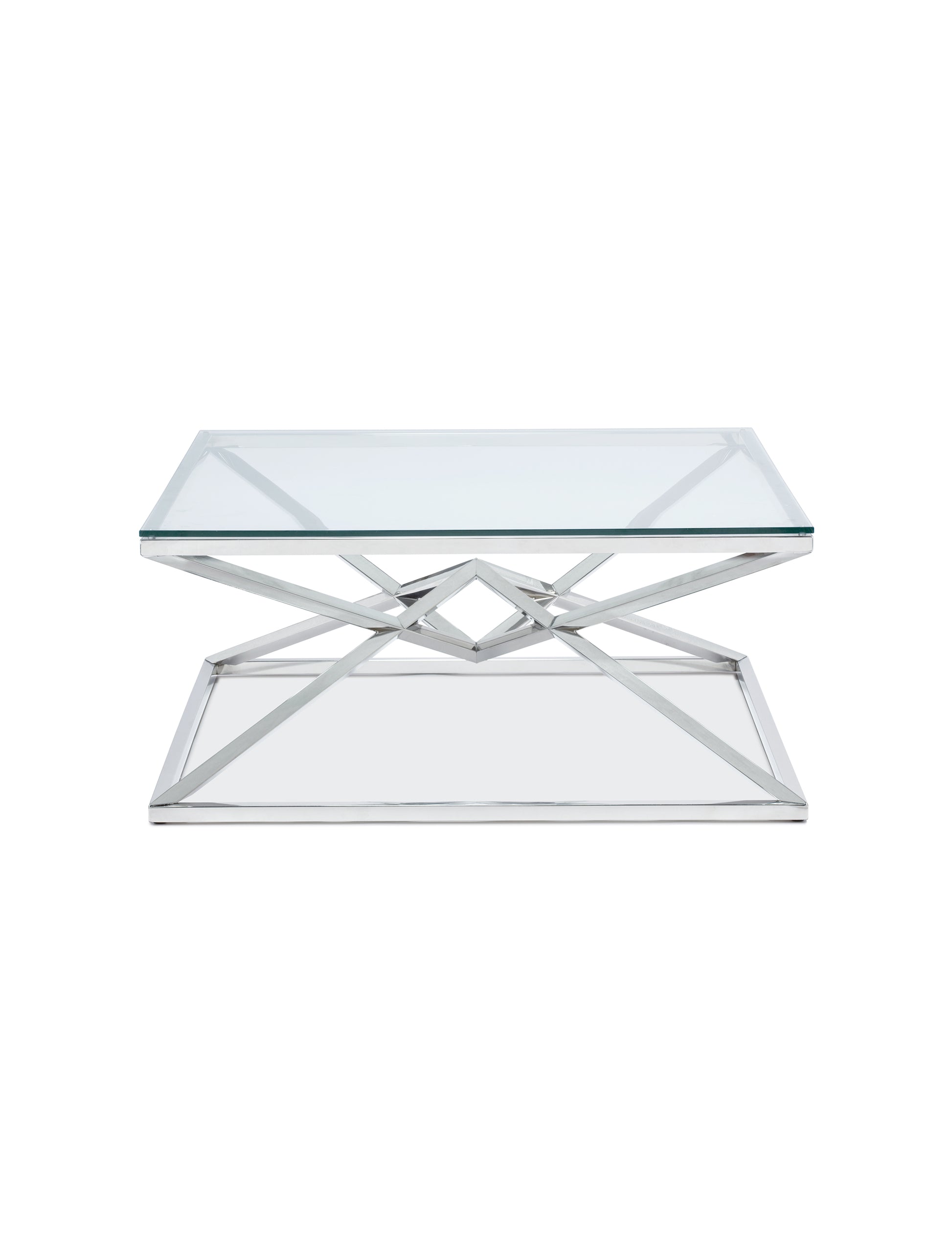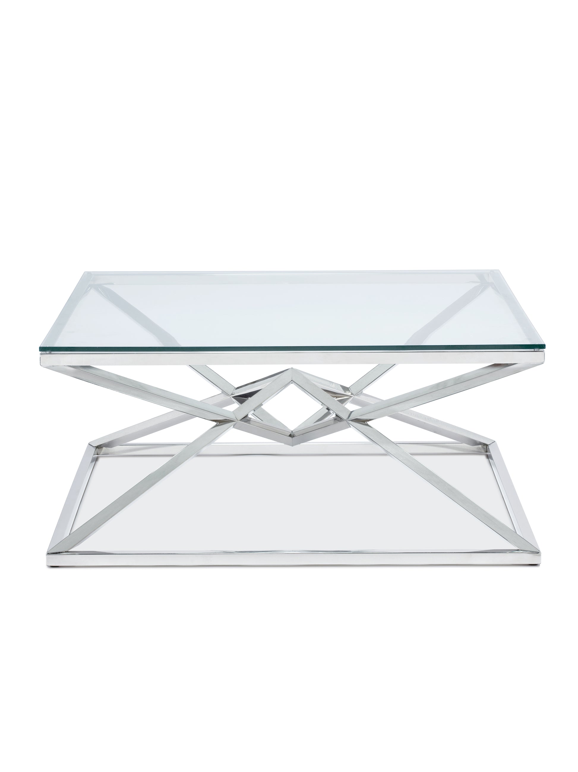 A modern pyramid structured coffee table with the perfect squared design. It features a polished steel body with two overlapping pyramid designs that connect at the center. The top is made from glass which compliments perfectly the metallic body at the bottom.
