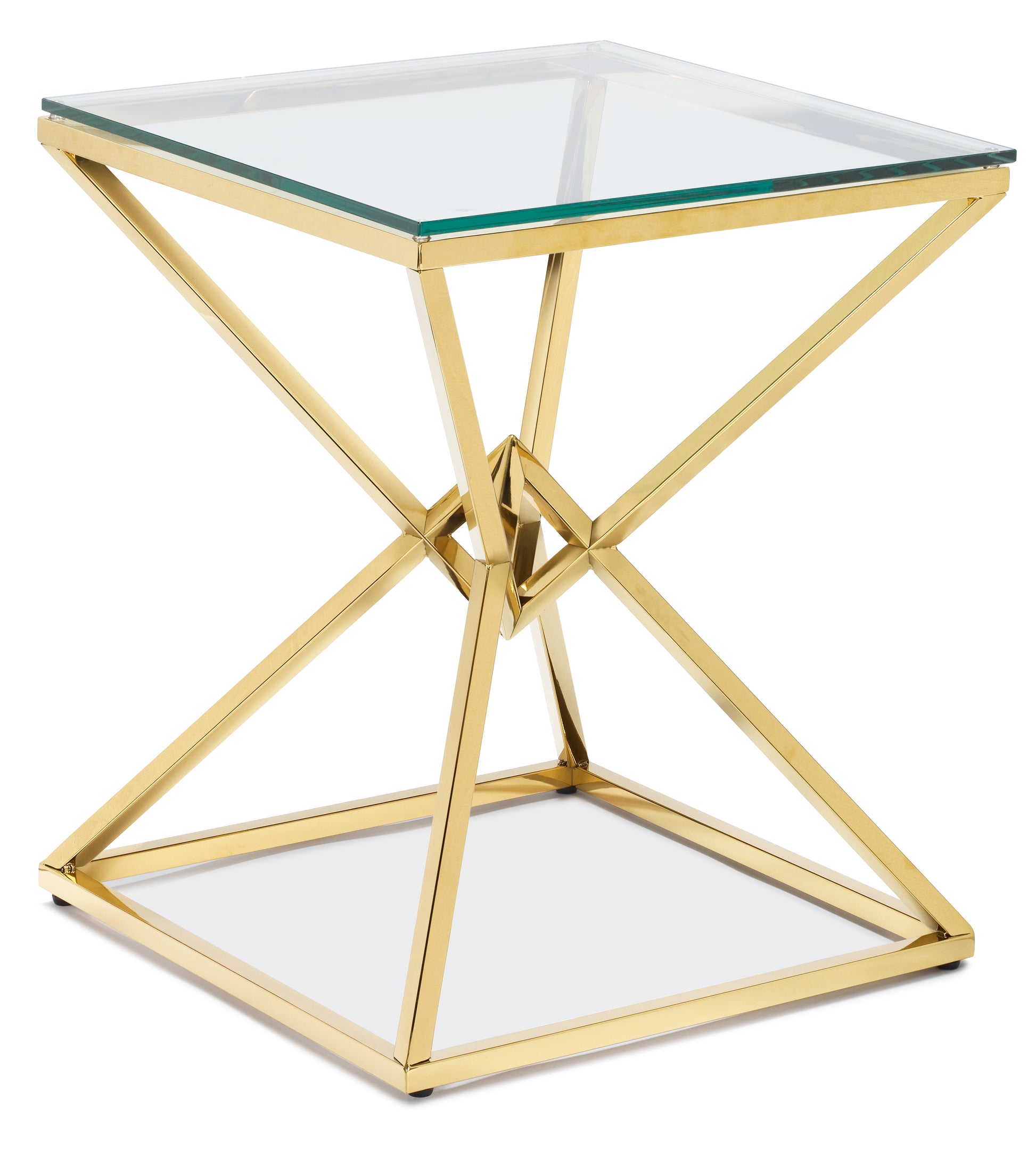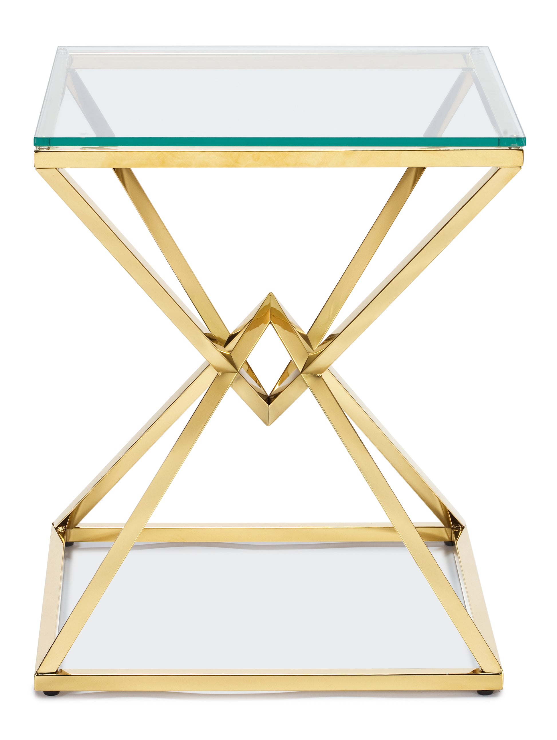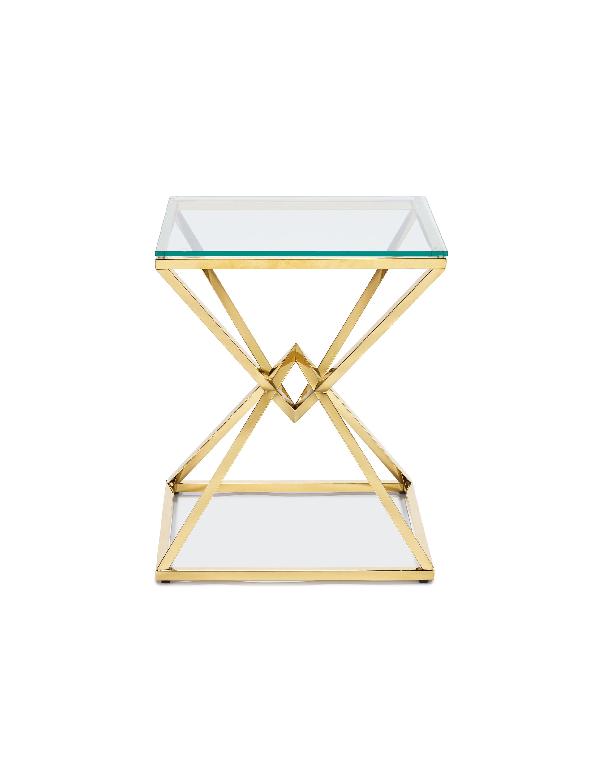 A modern pyramid structured end table with the perfect squared design. It features a polished steel body with two overlapping pyramid designs that connect at the center. The top is made from clear glass which compliments perfectly the metallic body at the bottom.