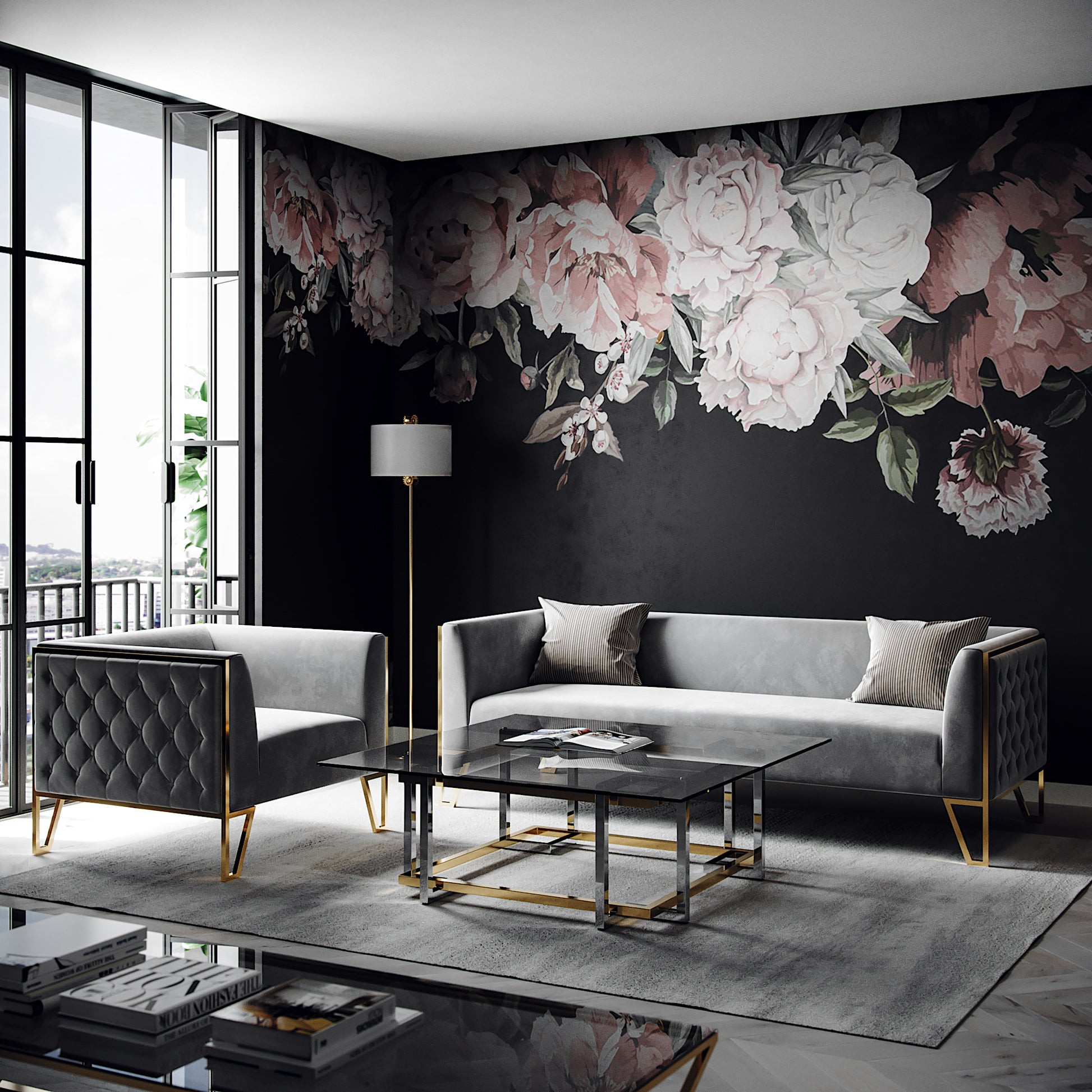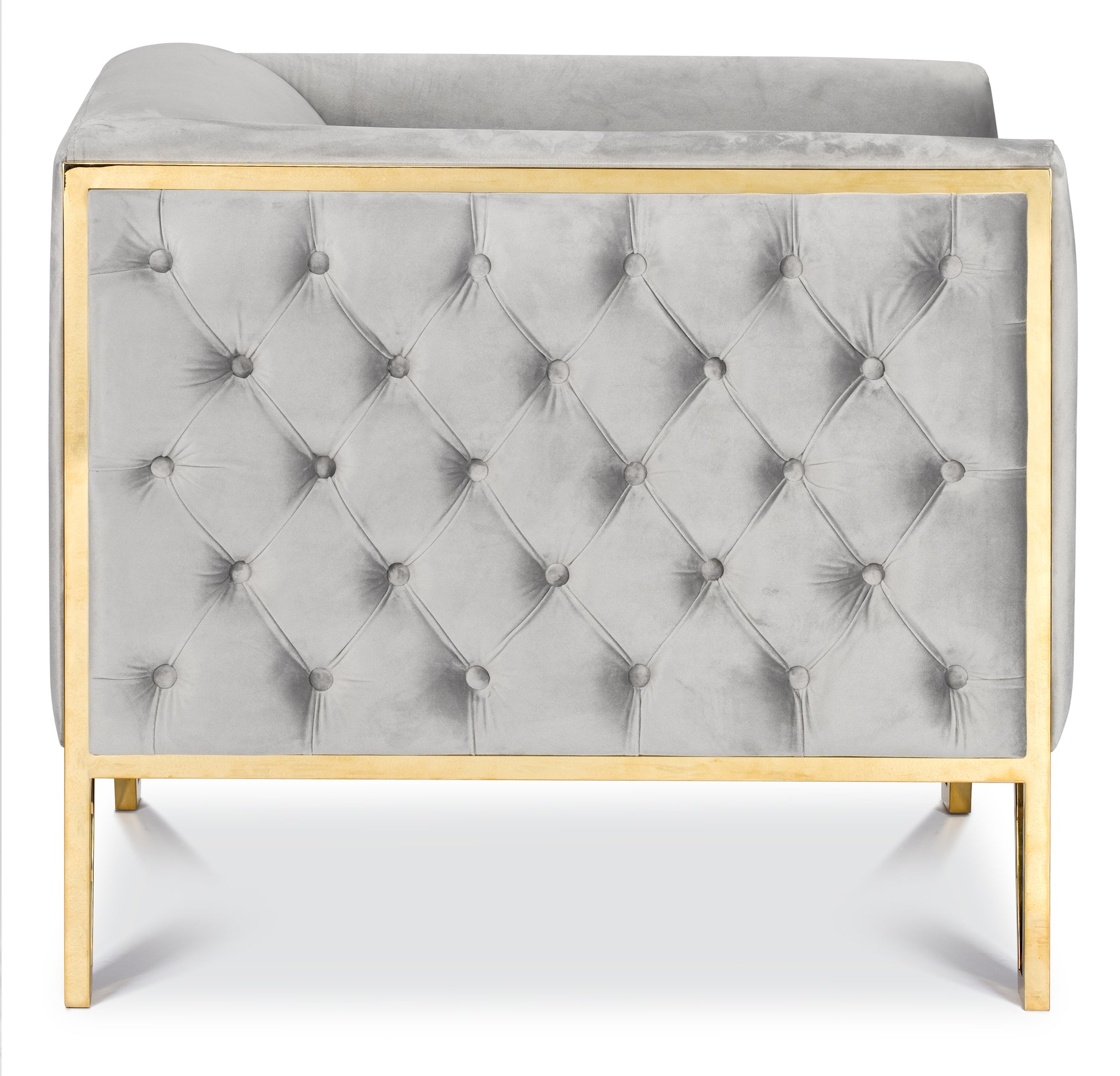 Tuxedo style accent chair perfect for making statements. Grey velvet throughout the body and through the sides of the sofa. A very regal look with a touch of modernity with the steel frame throughout the edges and legs of the model.