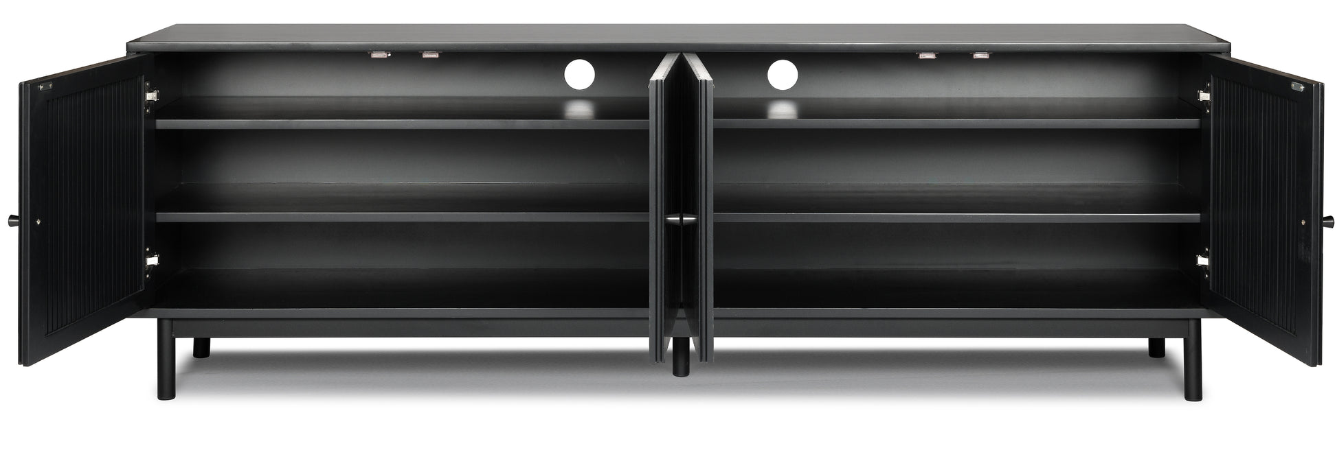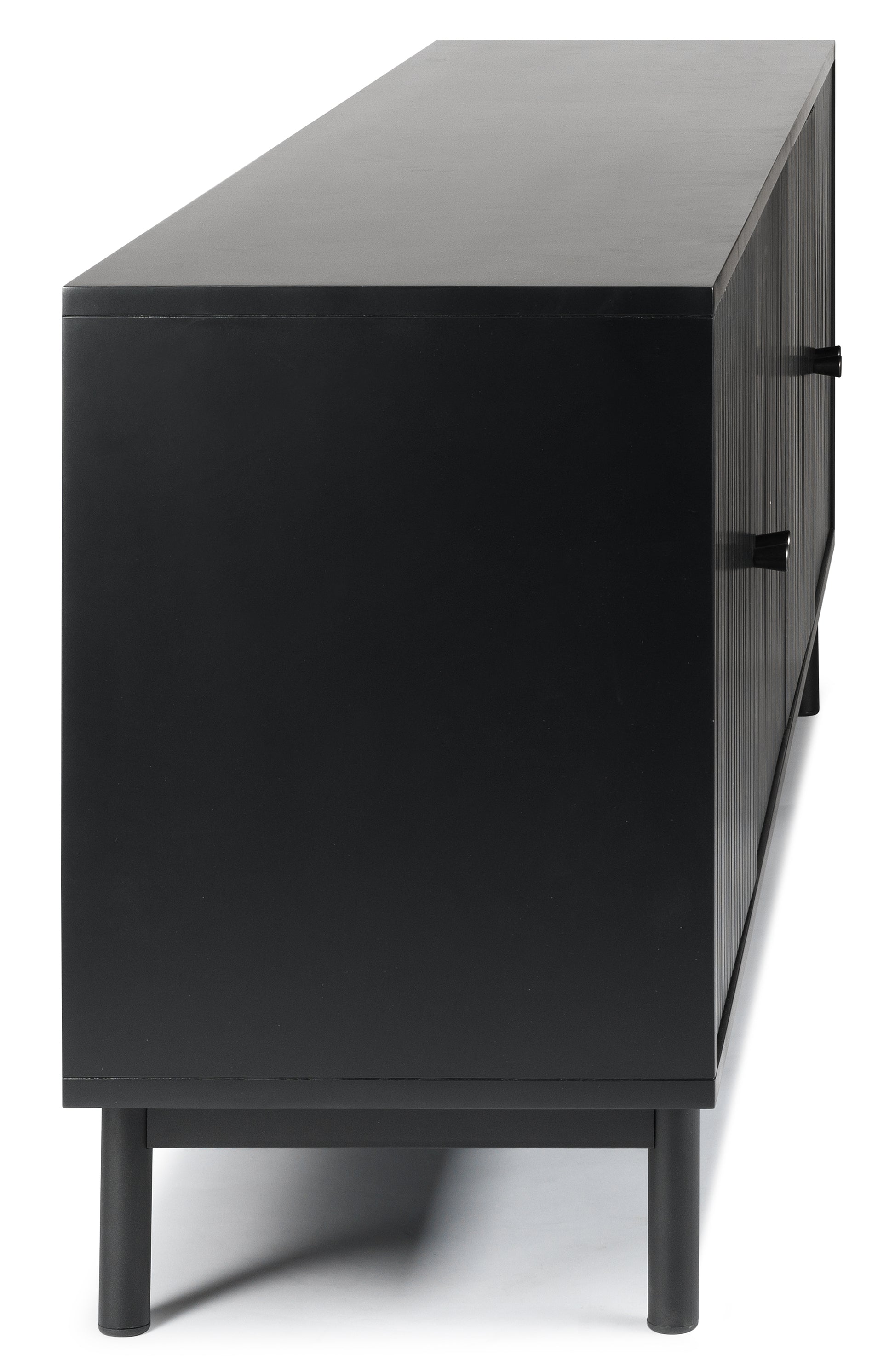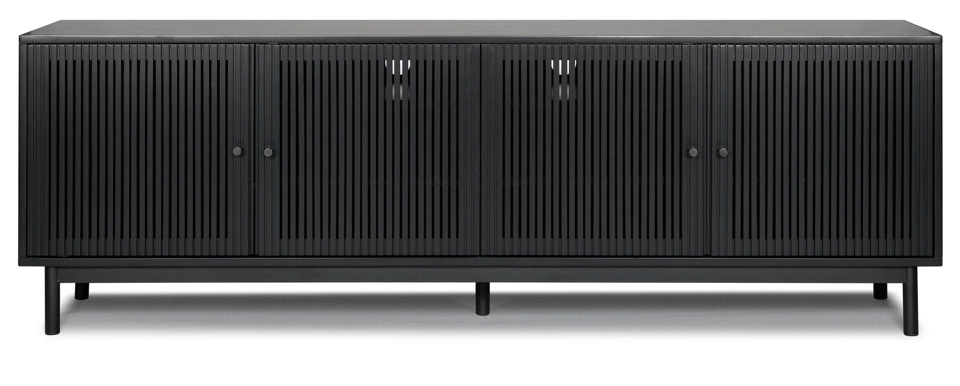This is a mid-century style TV stand, with a long rectangular body. Offers plenty of storage with cabinet space . The cabinets are decorated with wood ridges along the doors, bringing out the natural acacia wood features beautifully.