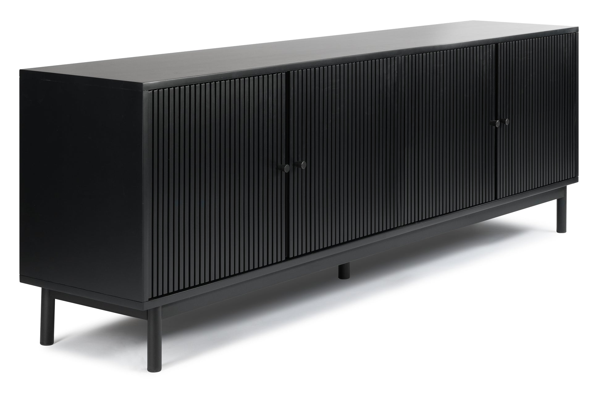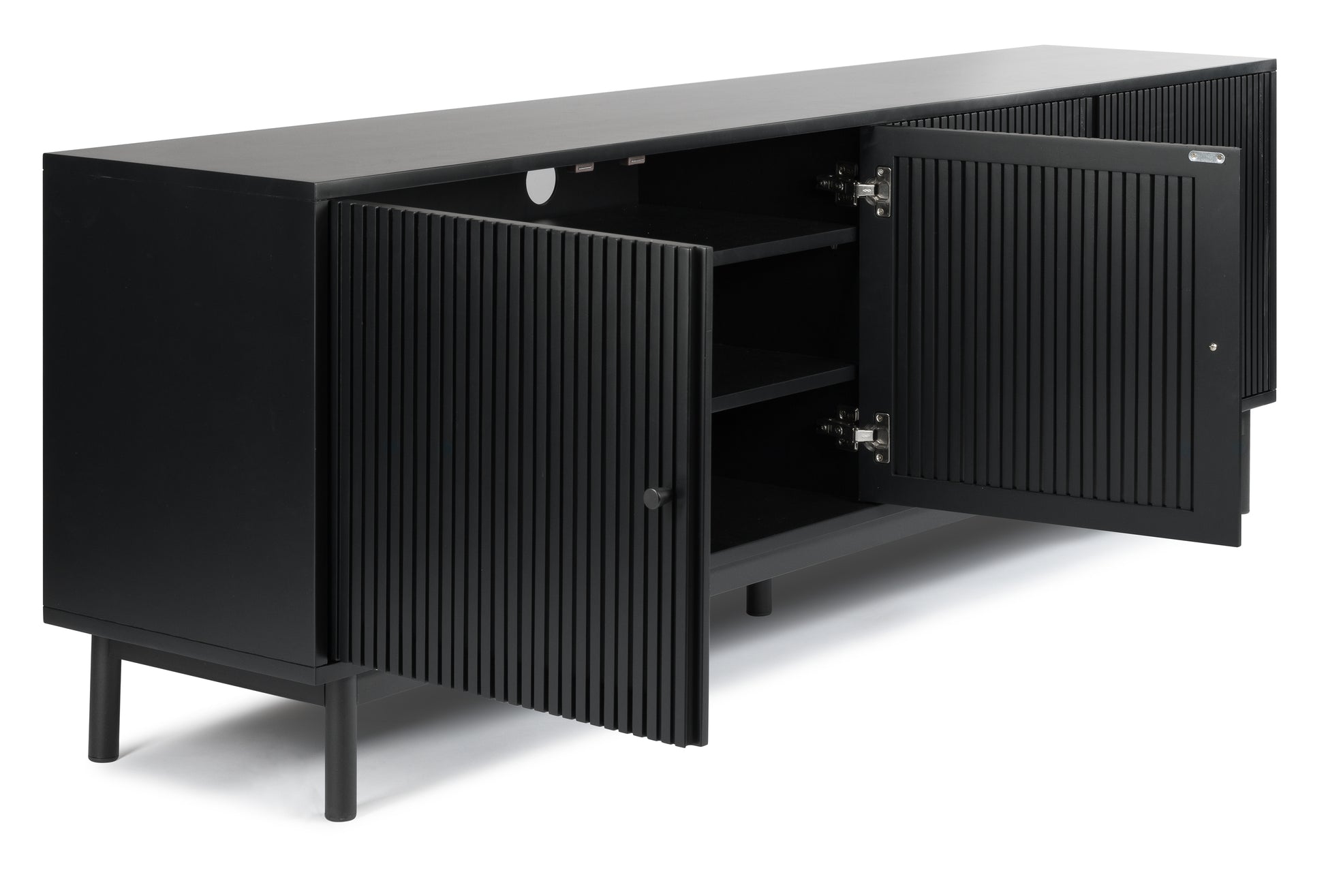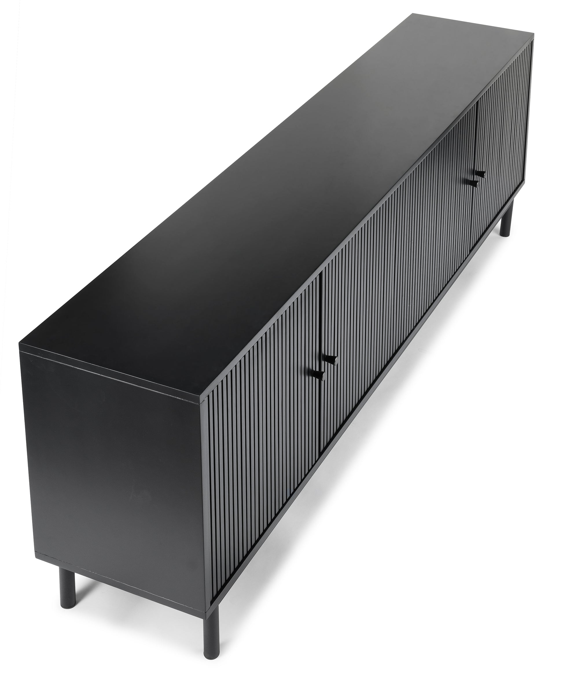 This is a mid-century style TV stand, with a long rectangular body. Offers plenty of storage with cabinet space . The cabinets are decorated with wood ridges along the doors, bringing out the natural acacia wood features beautifully.