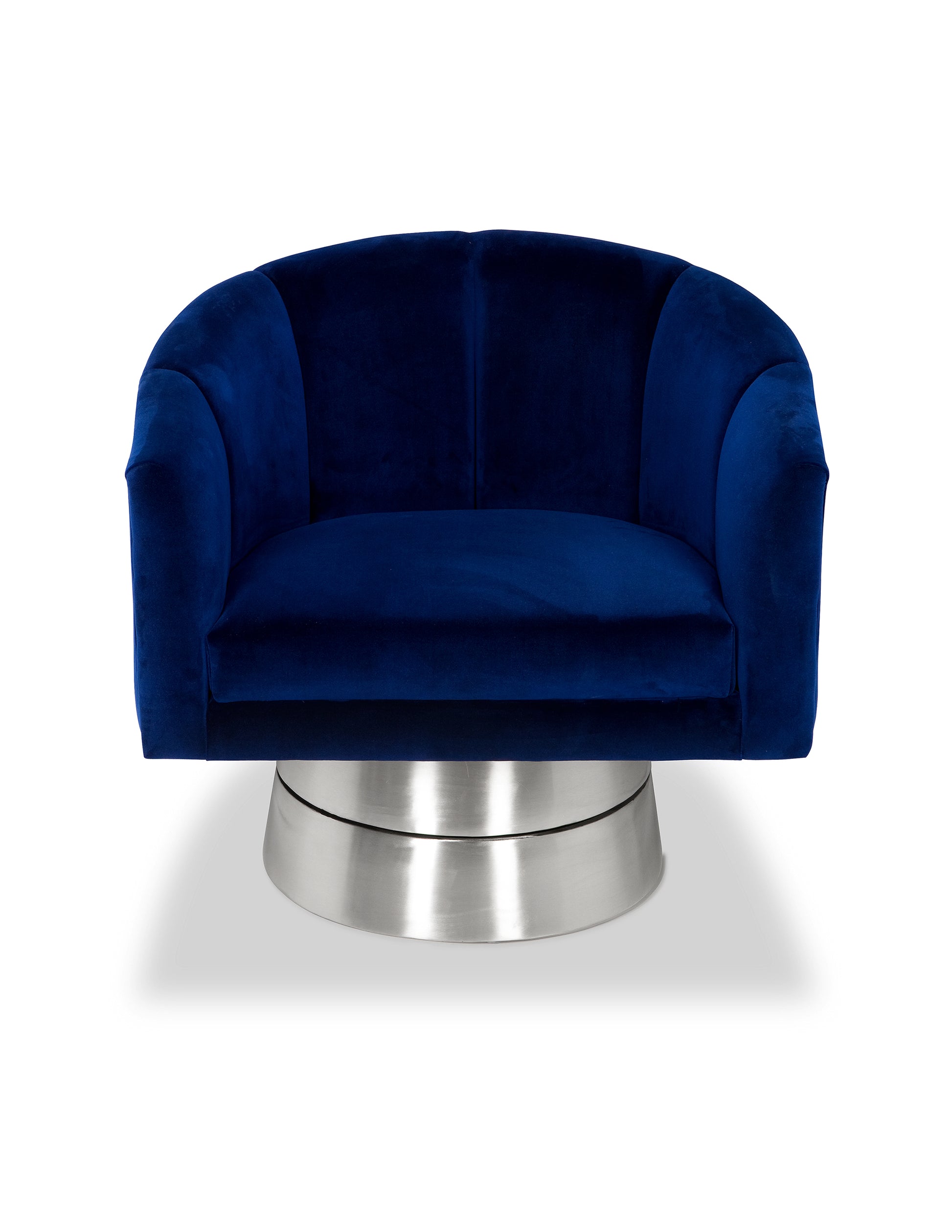 Sit back and unwind in this contemporary swivel arm chair. The perfect shade of grey velvet and a sleek brushed metal base that creates a modern with a hint of retro style that you want. It is a dynamic design that requires no other piece around. Revamping the traditional chair and providing exceptional comfort, custom made for someone who loves bold pieces.