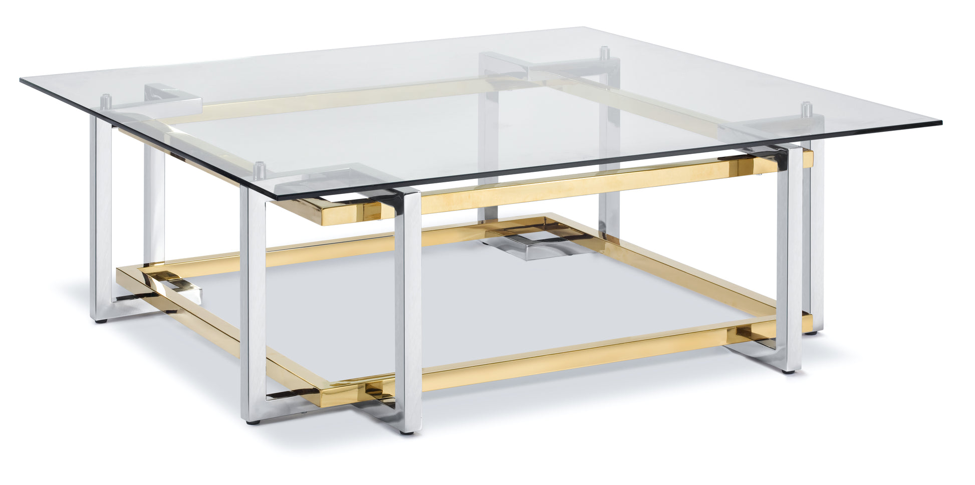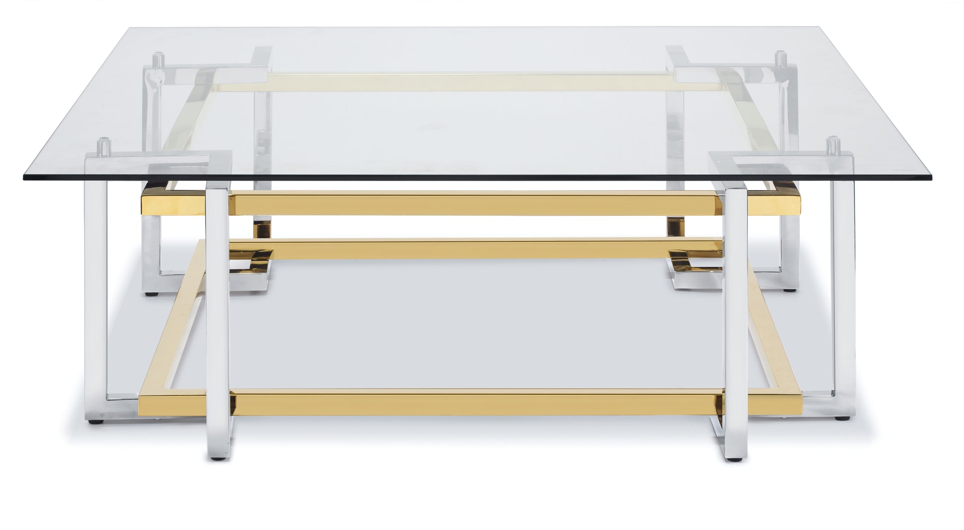 Modern style squared steel coffee table. It has clear glass top over a mixed steel and gold polished base. An ideal piece with a contemporary design that ties together the entire table.