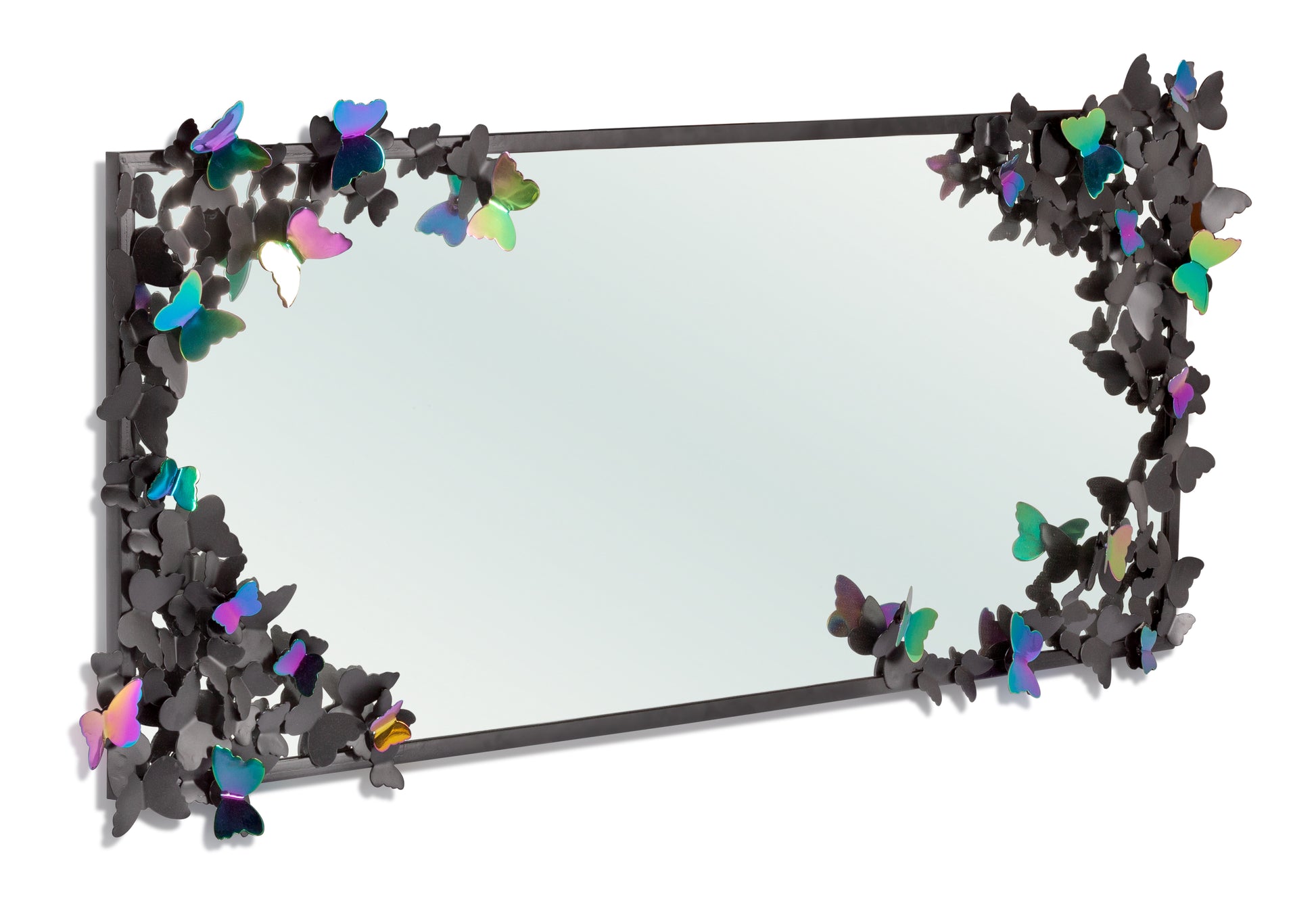 A truly unique and feminine high-quality mirror provides a graceful atmosphere that is ideal for a modern inspired room. This versatile piece hangs vertically or horizontally, so it's equally suited to sit above your vanity or on a bedroom wall. This eye-catching statement piece displays speckles of butterfly in a matte black finish and a reflective rainbow finish on the edge of the mirror.