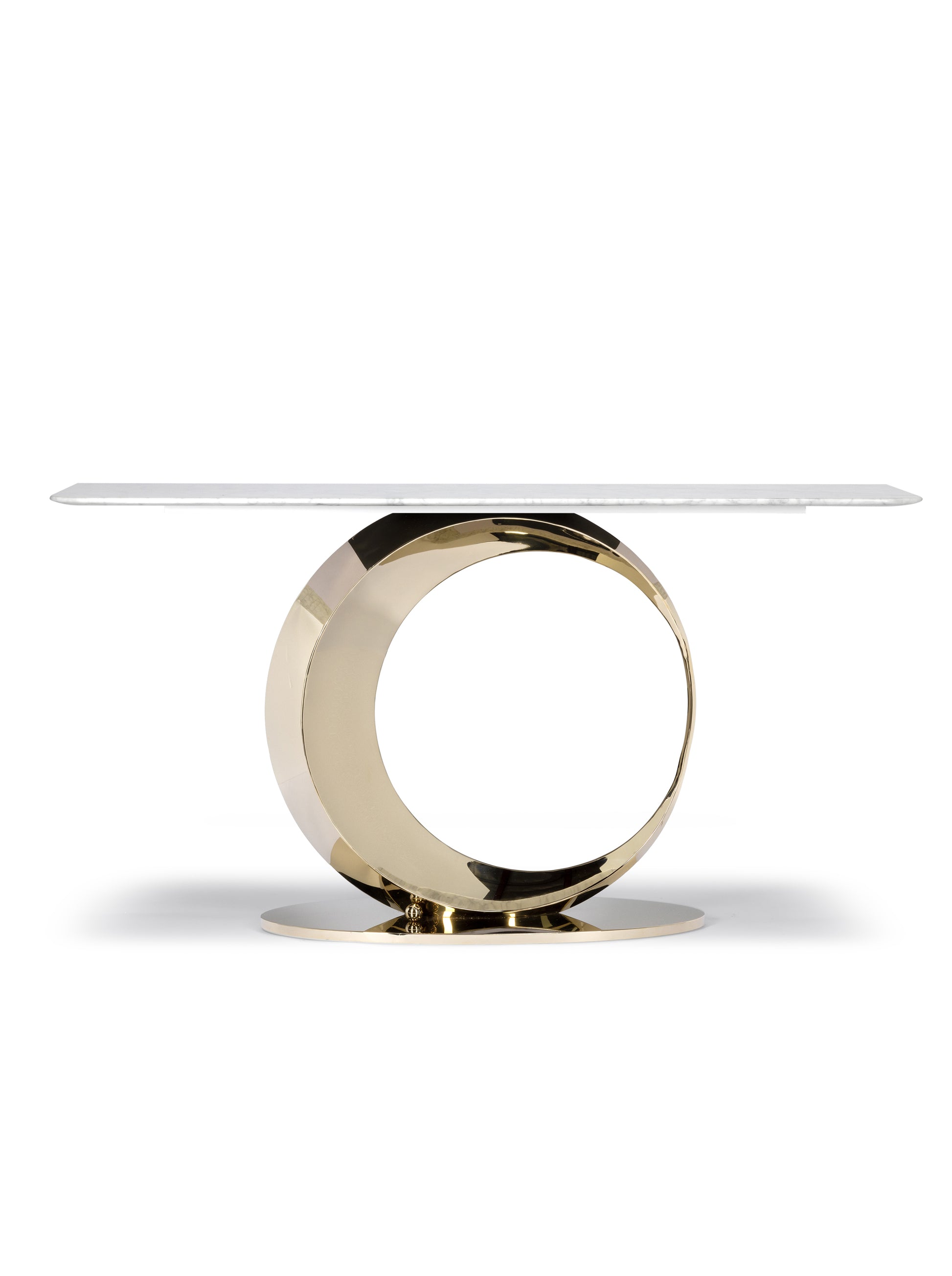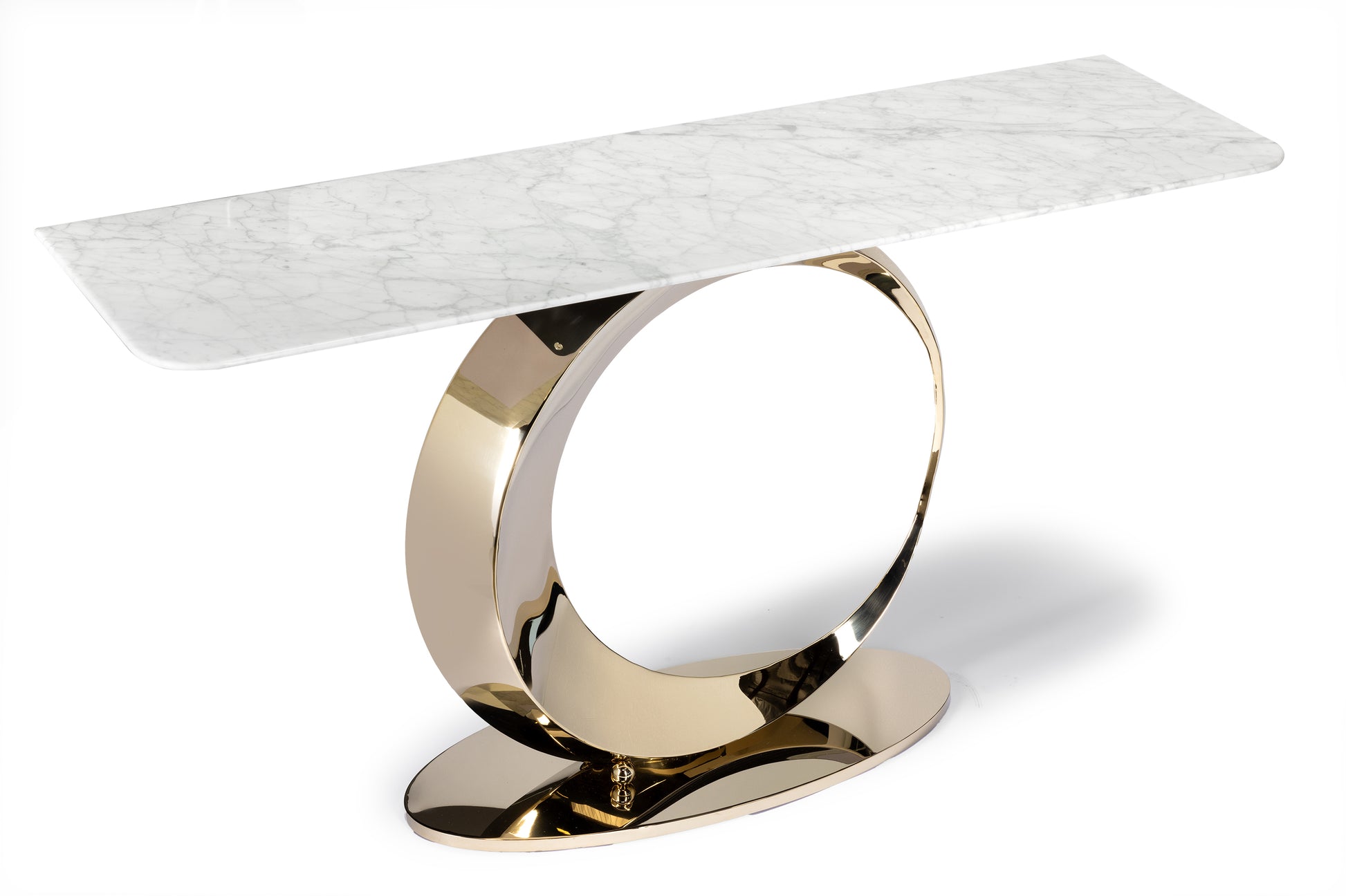 This rectangular console table brings an infusion of ultra-modern sophistication to your space. Its light gold polished stainless steel base showcases an exquisite geometric design that effortlessly catches the eye. Topped with a genuine marble surface, this piece exudes elegance and versatility, making it a stunning addition to any room in your home.