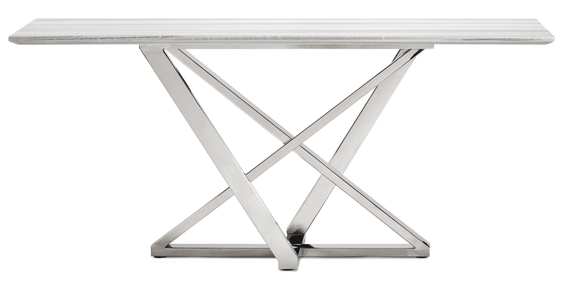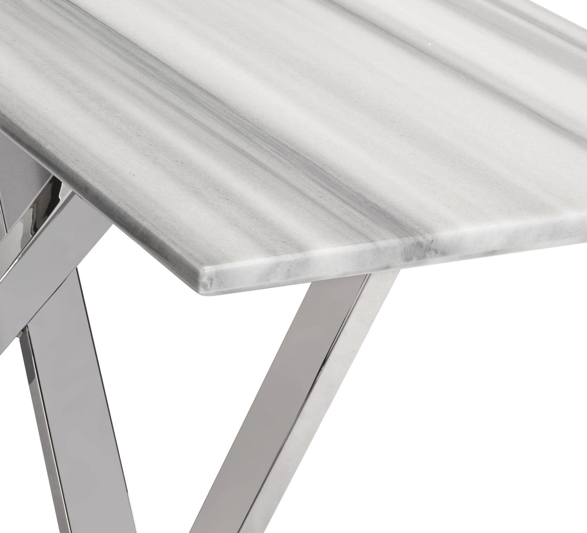 Straight vein marble top console table over unique polished steel base. A clean rectangular design made with high quality material that is worth being shown off in any living room area.
