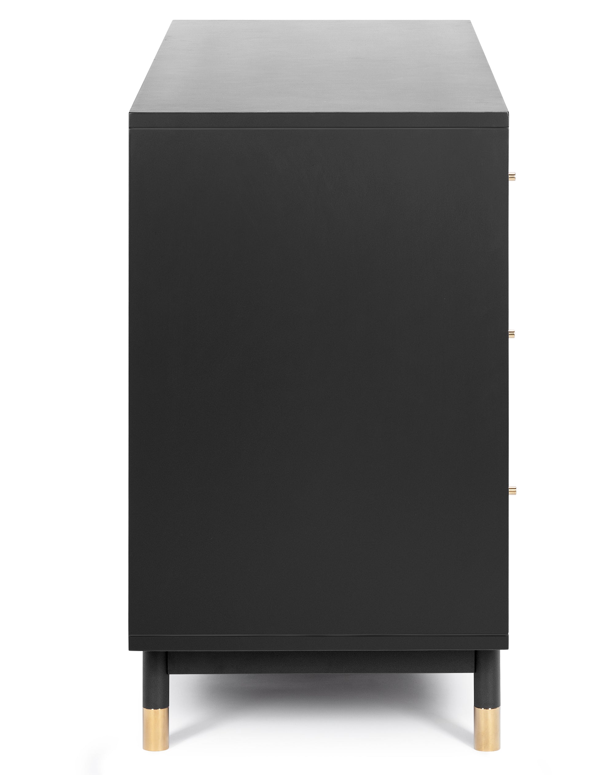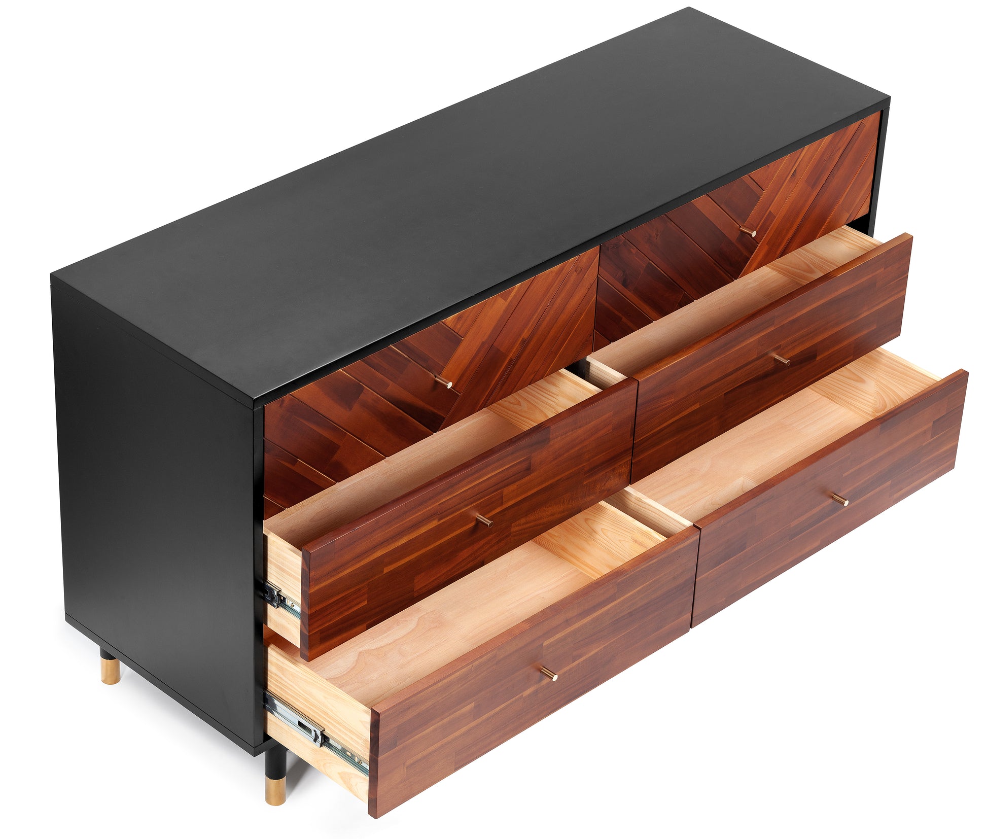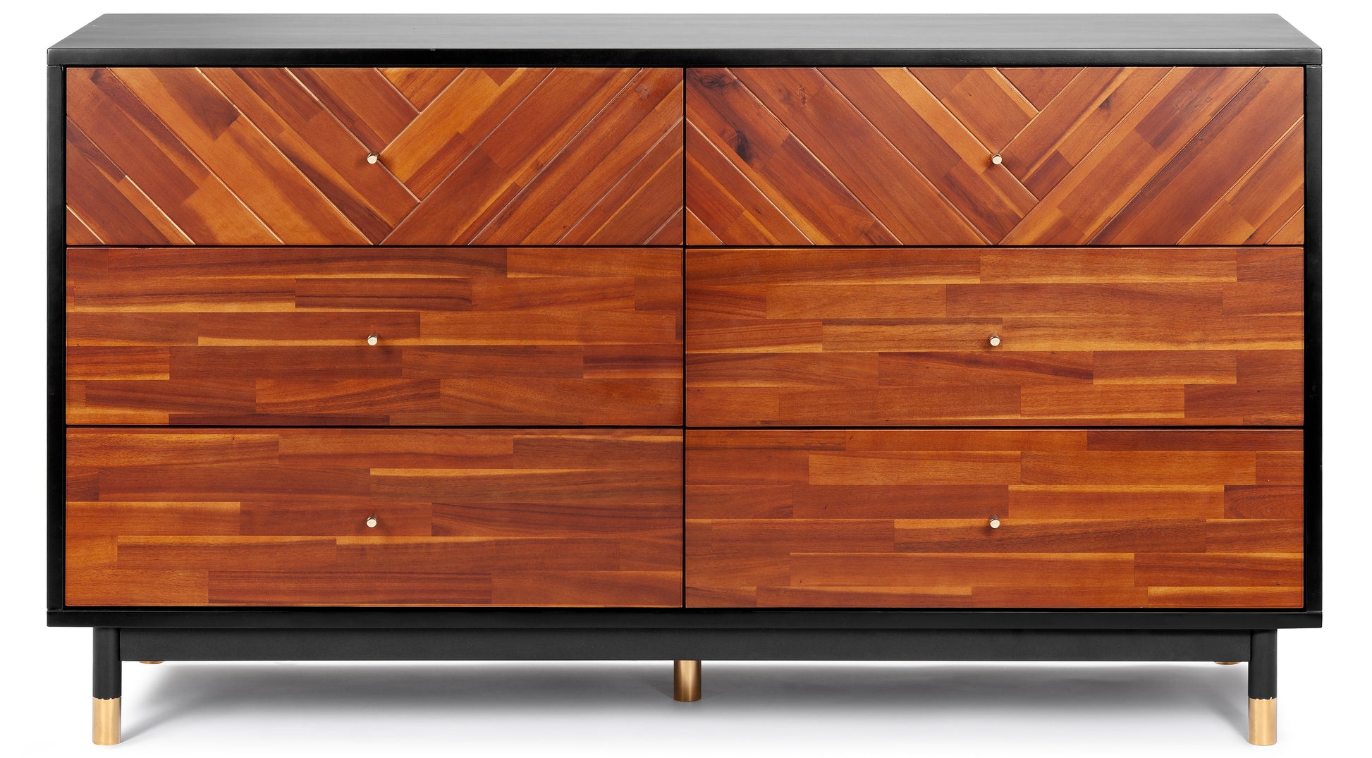 Tuck away essential articles of clothing in style with this double dresser, a sleek and minimalist piece that’s sure to grab glances in the bedroom. Standing on top of slim legs, it features a wood body and drawers accented by a gold-color design. Each of the six full drawers slides out on roller glides to reveal plenty of space to tuck away clothes.