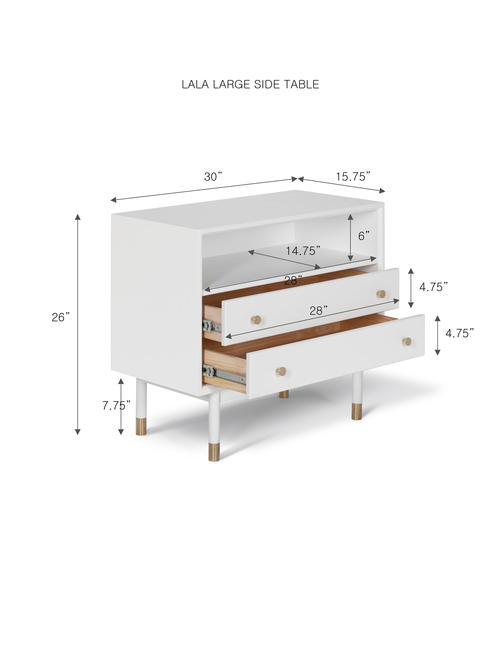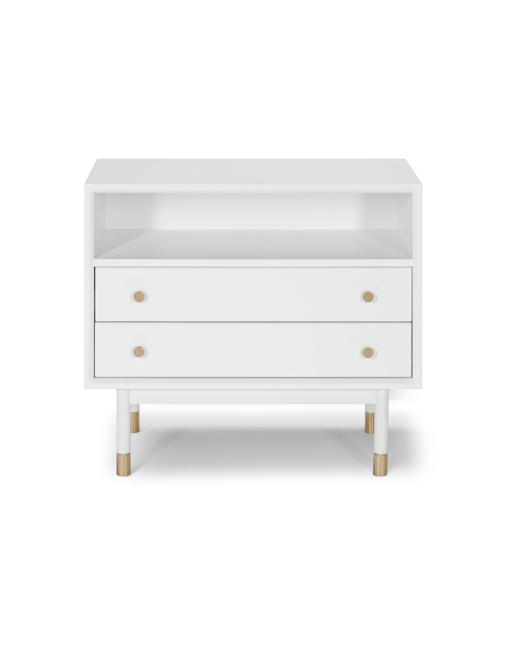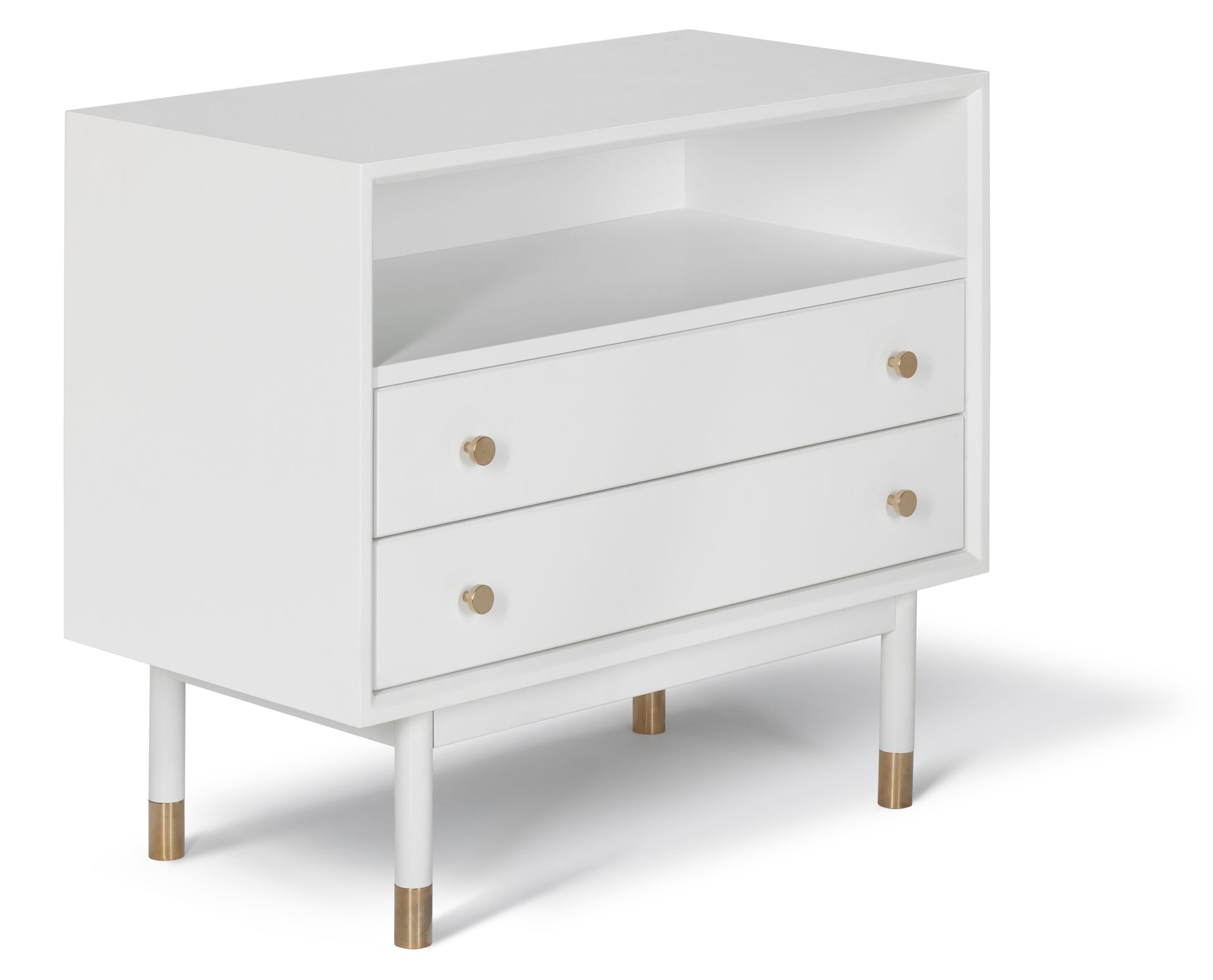 From chic gold knobs to tubing on legs, it's all in the detail for this line. Lofted on slender legs, this side table is made of solid wood in satin white finish for light and casual look with a significant dose of charm.
