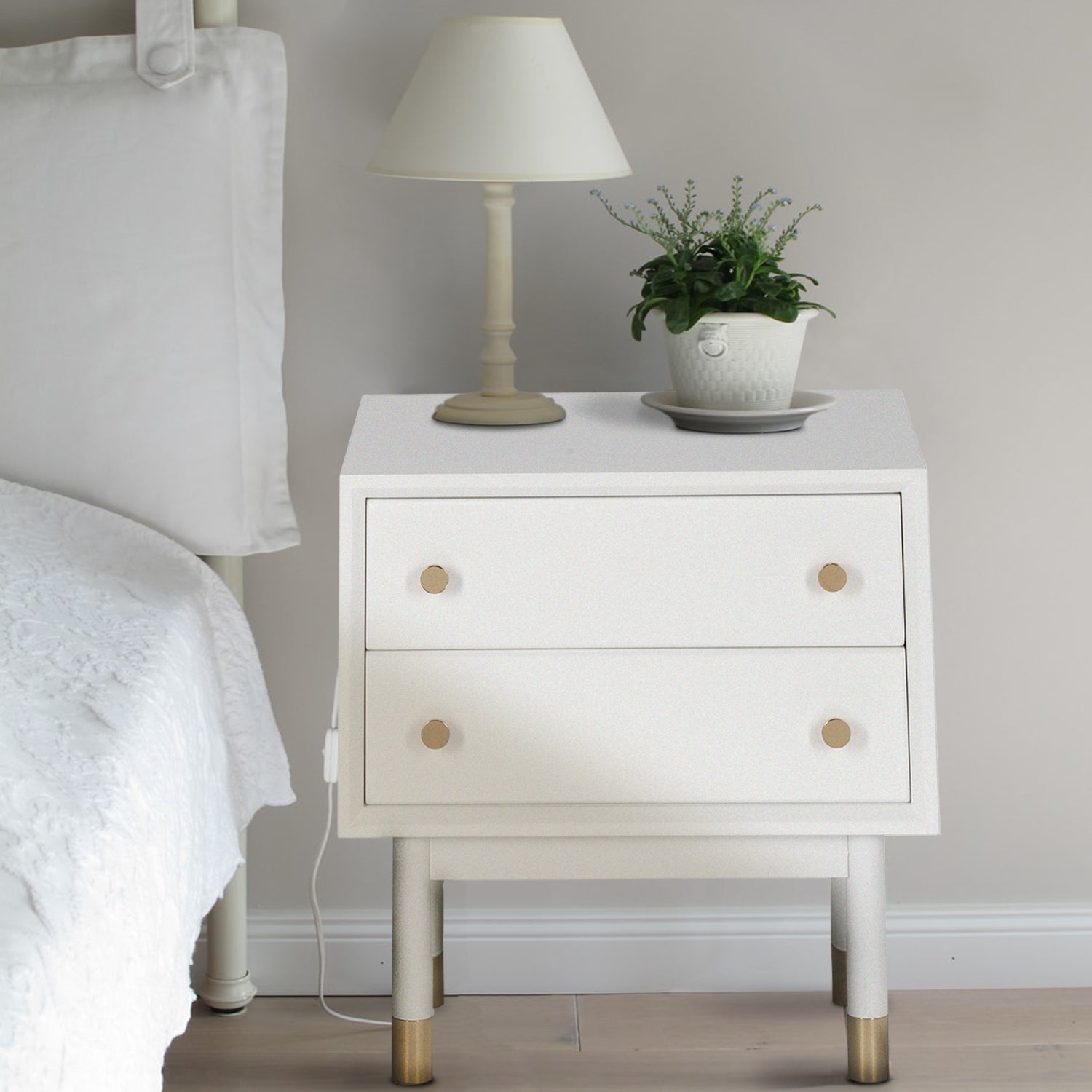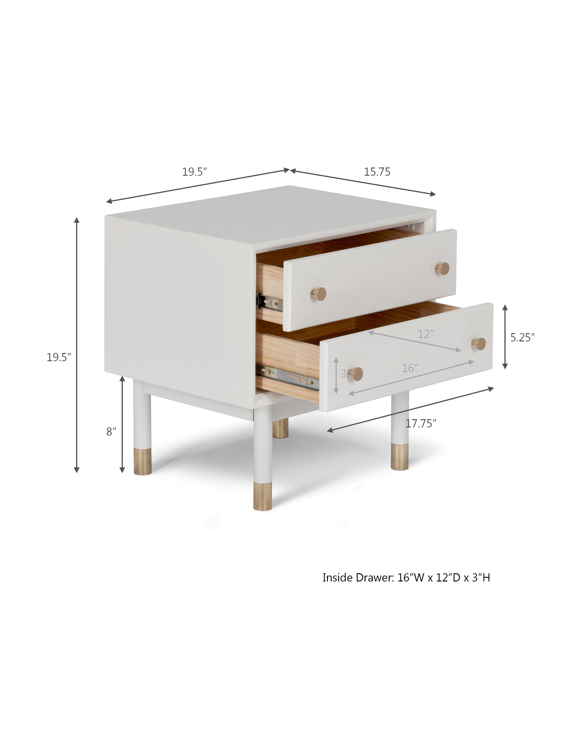 From chic gold knobs to tubing on legs, it's all in the detail for this line. Lofted on slender legs, this side table is made of solid wood in satin white finish for light and casual look with a significant dose of charm.