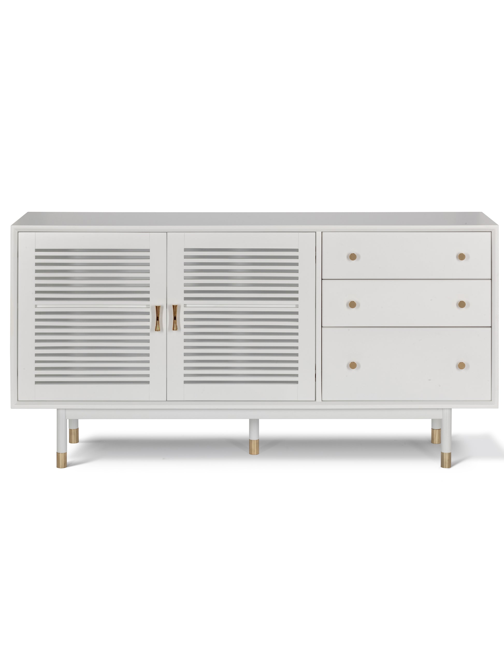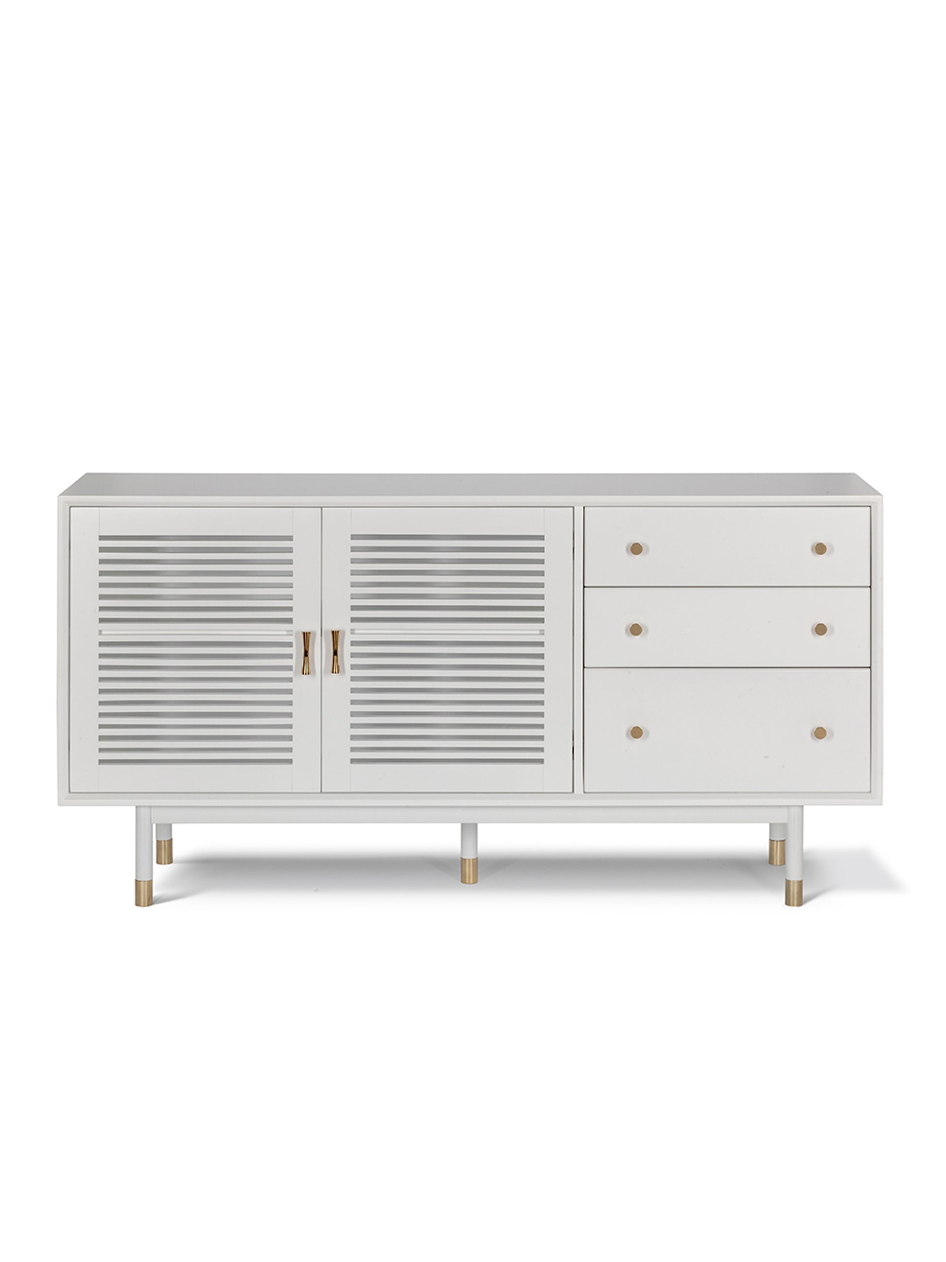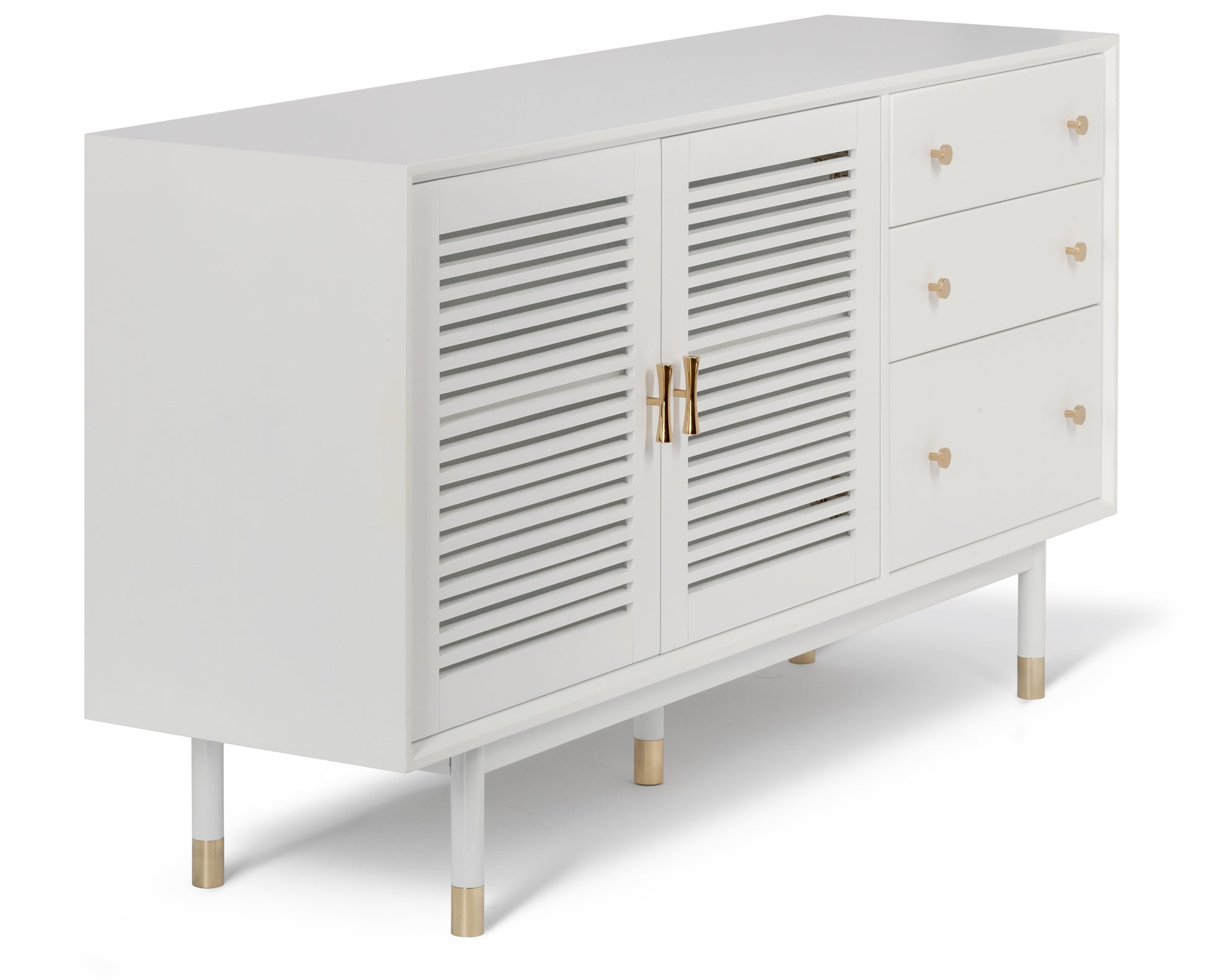 From chic gold knobs to tubing on legs, it's all in the detail for this line. Lofted on slender legs, this cabinet is made of solid wood in satin white finish for light and casual look with a significant dose of charm.