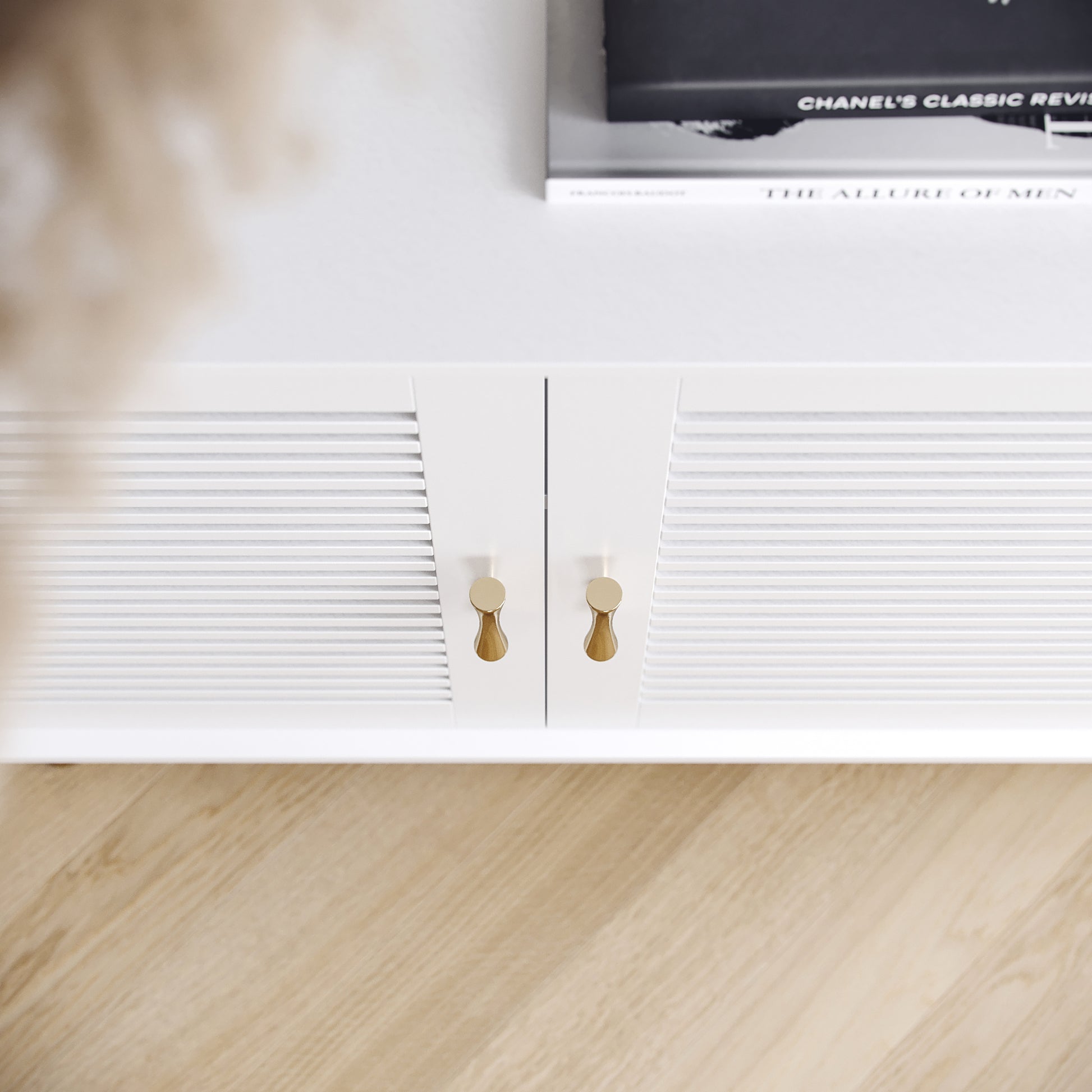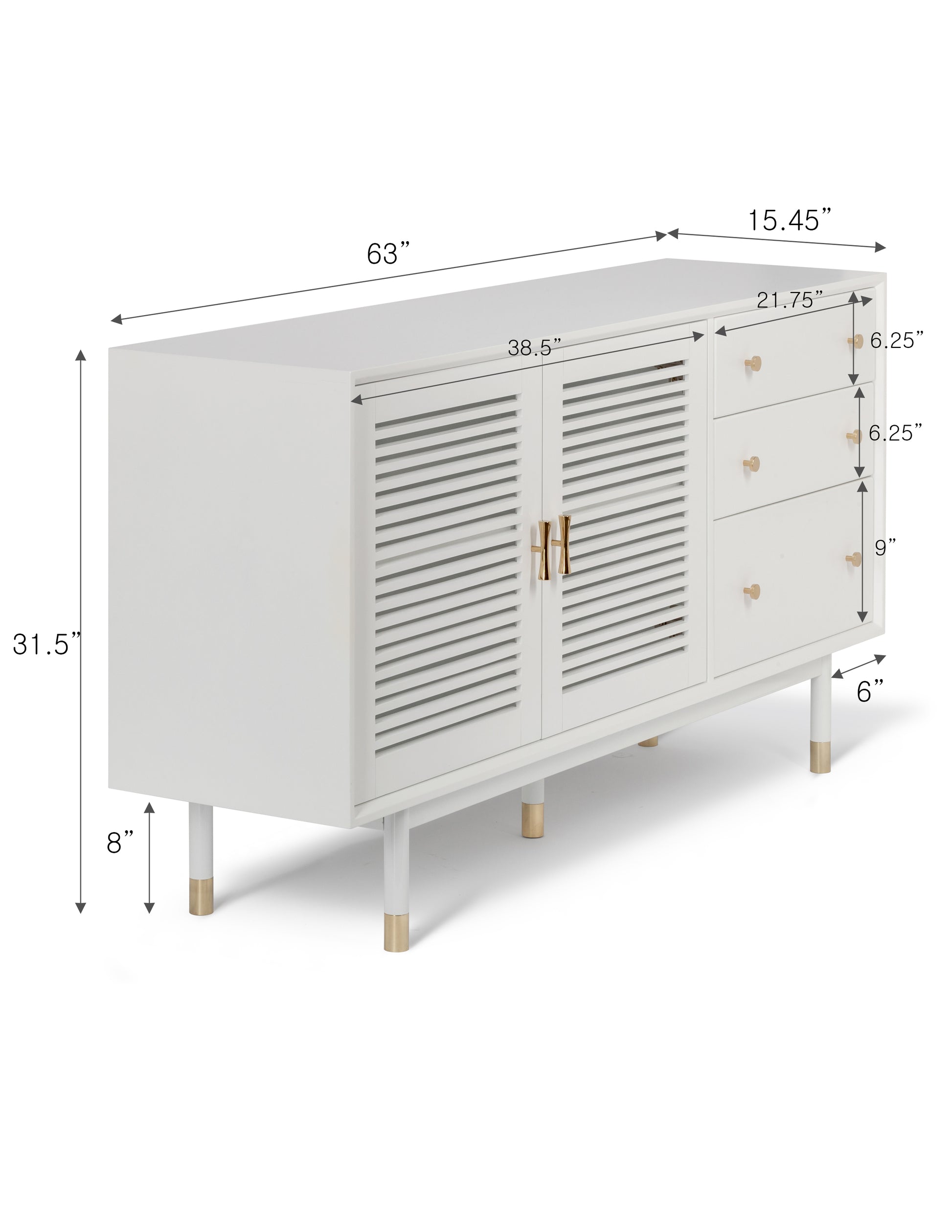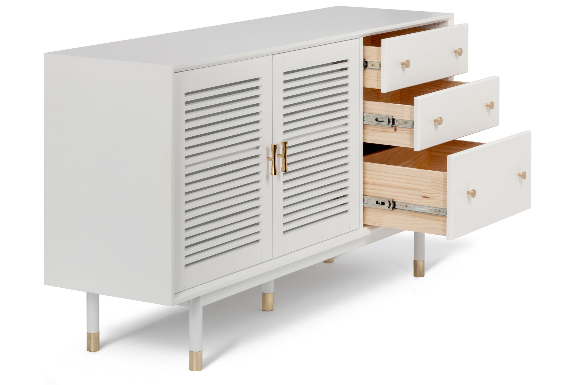 From chic gold knobs to tubing on legs, it's all in the detail for this line. Lofted on slender legs, this cabinet is made of solid wood in satin white finish for light and casual look with a significant dose of charm.