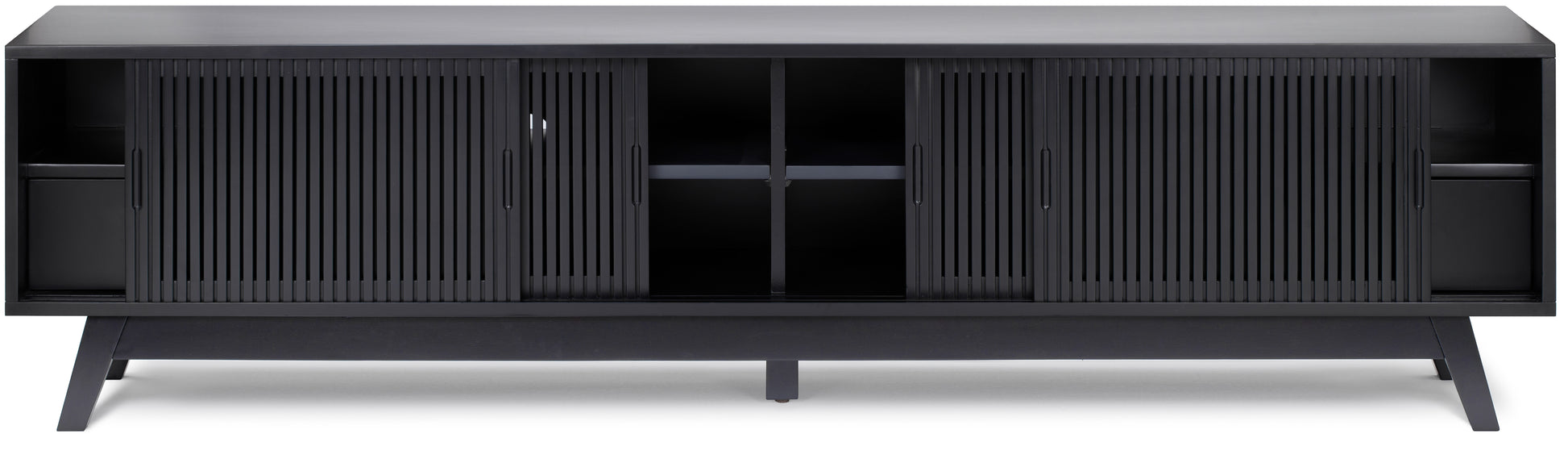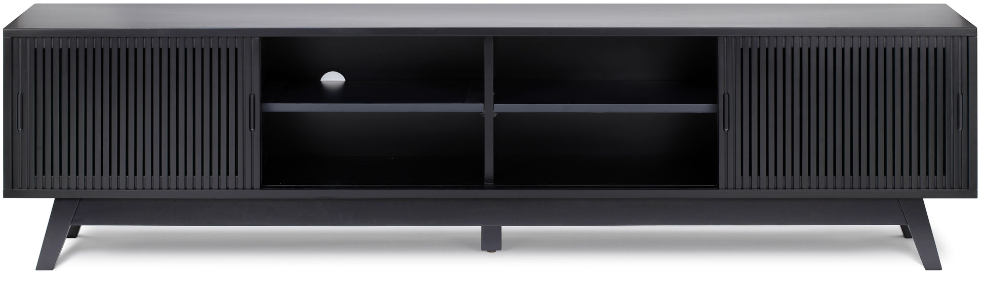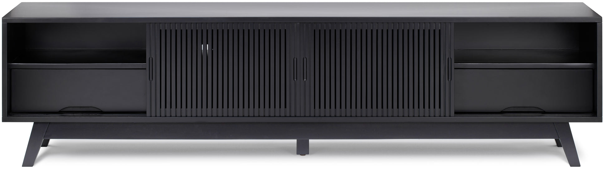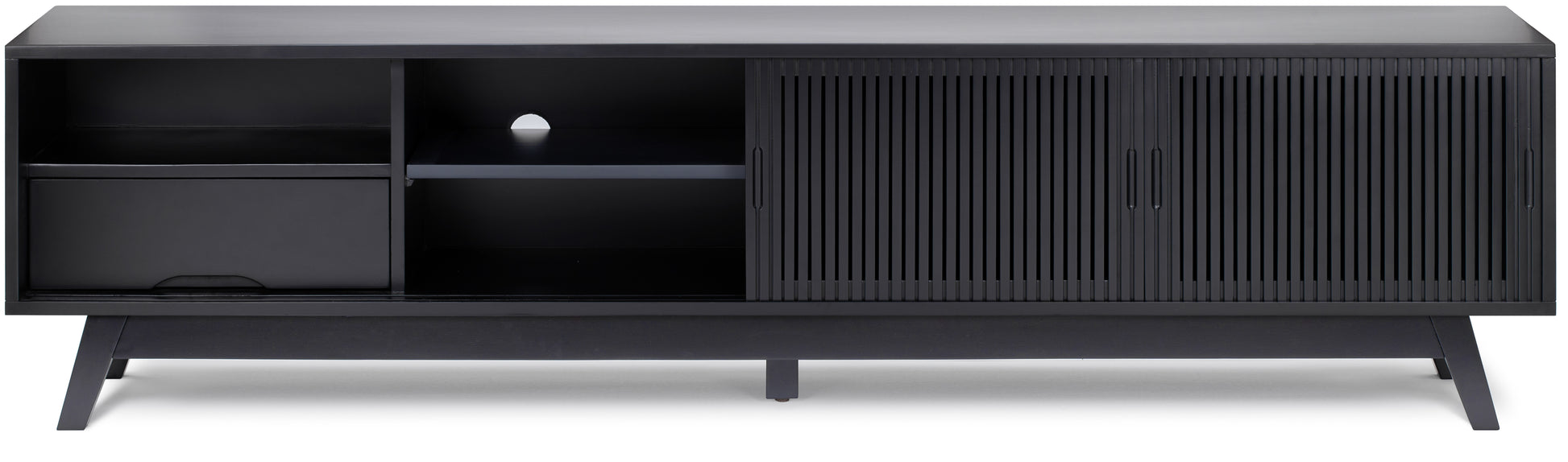 The ideal mid-century TV stand for any living area. Newburry TV stand features a solid acacia wood body throughout, including the legs. It includes 2 drawers and 6 shelves, creating plenty of room to store things in. This model can blend into any setting you place it in.