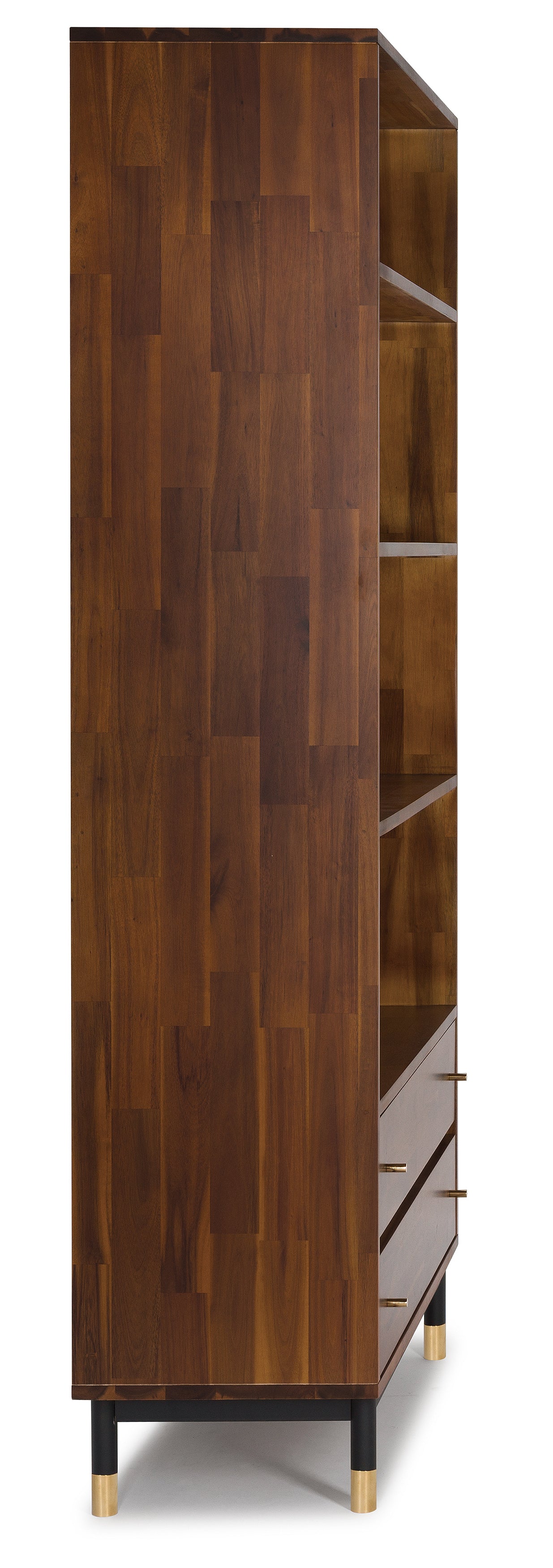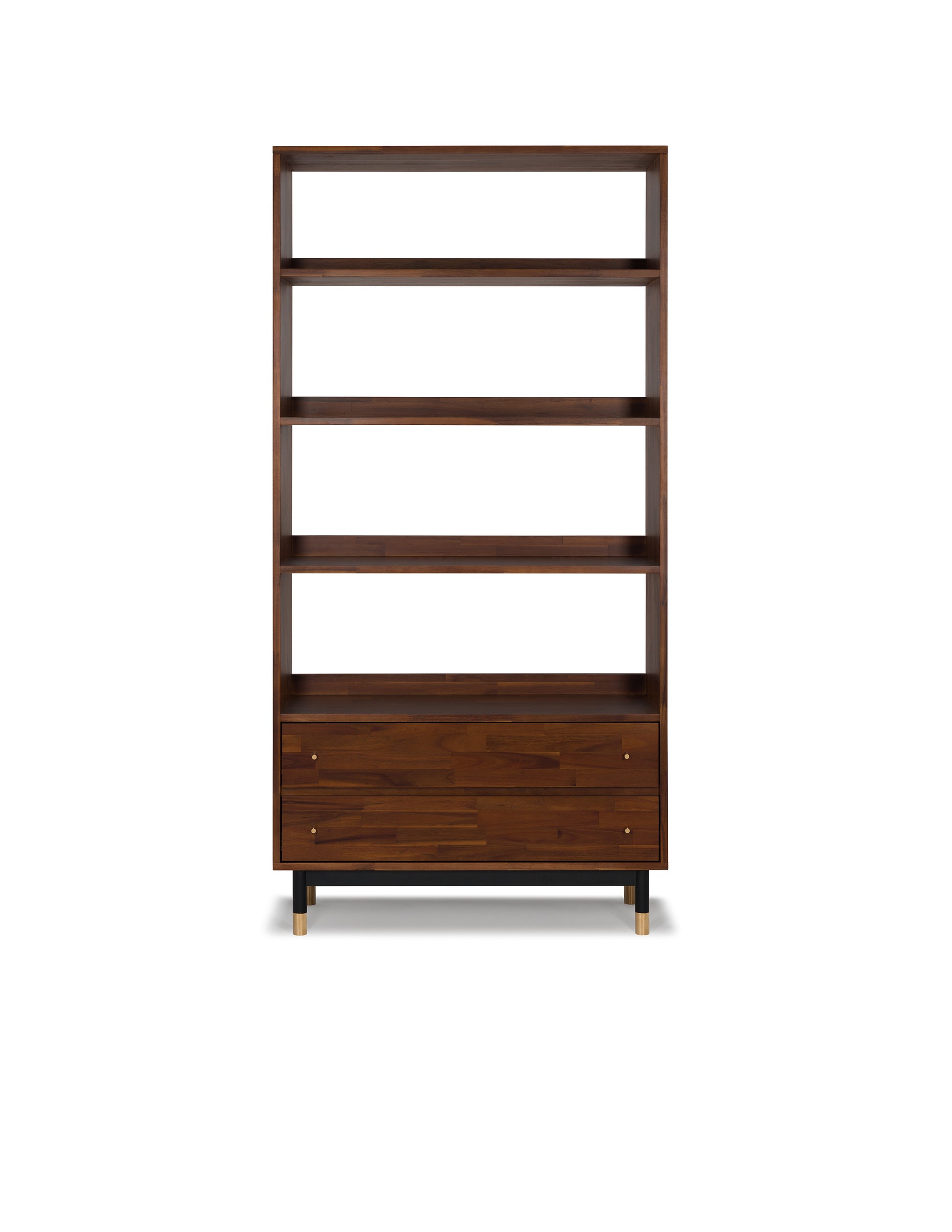 This bookcase provides a new touch to our classic Soho bookcase. Replacing the bottom shelf with two drawers, it offers additional storage that goes beyond the traditional open faced shelf. The black bottom frame and gold tipped legs give it an elevated feel from the wood body. This bookcase makes a nice addition to a mid-century modern room or as an additional accent to a room that features any of our other Soho collection pieces.