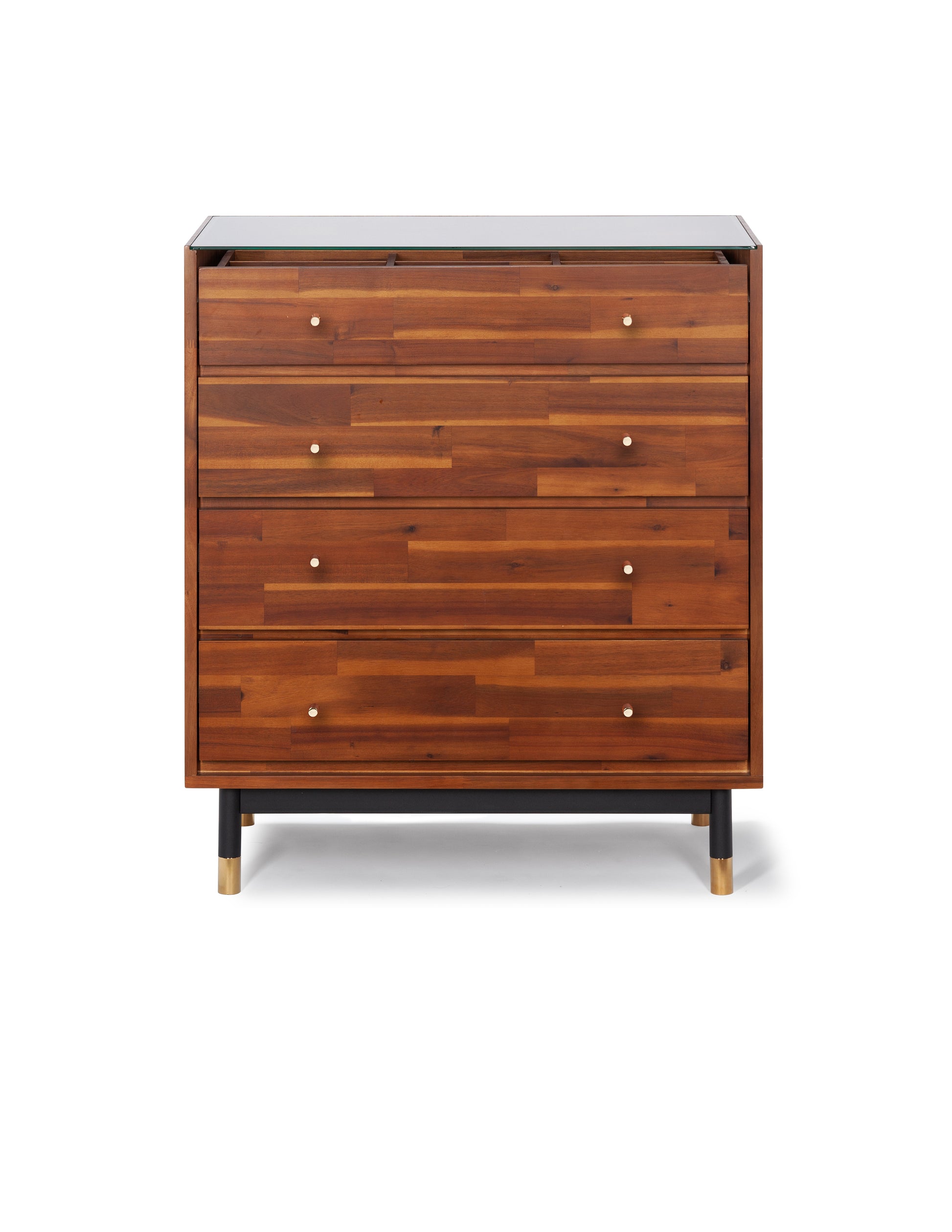 Soho Chest is a mid-century style chest with four drawers including the top drawer with storage for your accessories. Made with solid acacia wood, it shows the natural features of the wood beautifully. It's a perfect blend of retro and contemporary. The body is complemented by slim gold knobs and legs with gold tube detail.