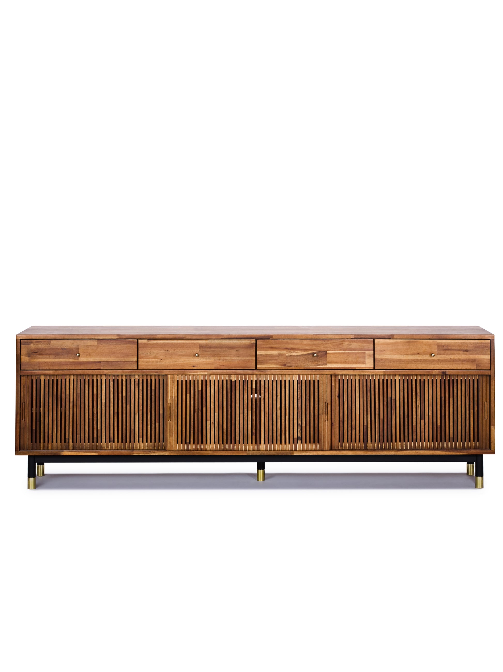 Soho is a mid-century style TV stand, with a long rectangular body. It is crafty design that features four small drawers on top and four textured sliding doors at the bottom that open up for more shelving space. The body is a solid acacia natural finish that portrays all of the natural features of the wood. The wood is complimented by the gold knobs and and legs, which overall ties this design together.