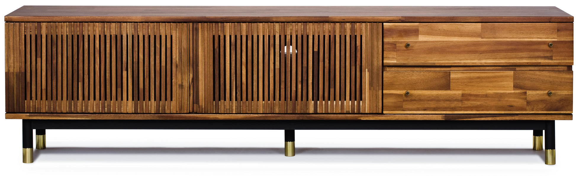 This is a mid-century style TV stand, with a long rectangular body. It is a slim yet spacious stand that has two drawers on one edge and two cabinets on the opposite side. The cabinets are beautifully decorated with wood ridges along the doors, which help the natural acacia wood features boast beautifully. The entire body is made from acacia wood which features all of its natural qualities, the wood is also complimented by the gold knobs and tubes on the legs. It is a beautiful mixture of mid-century and modern furniture.