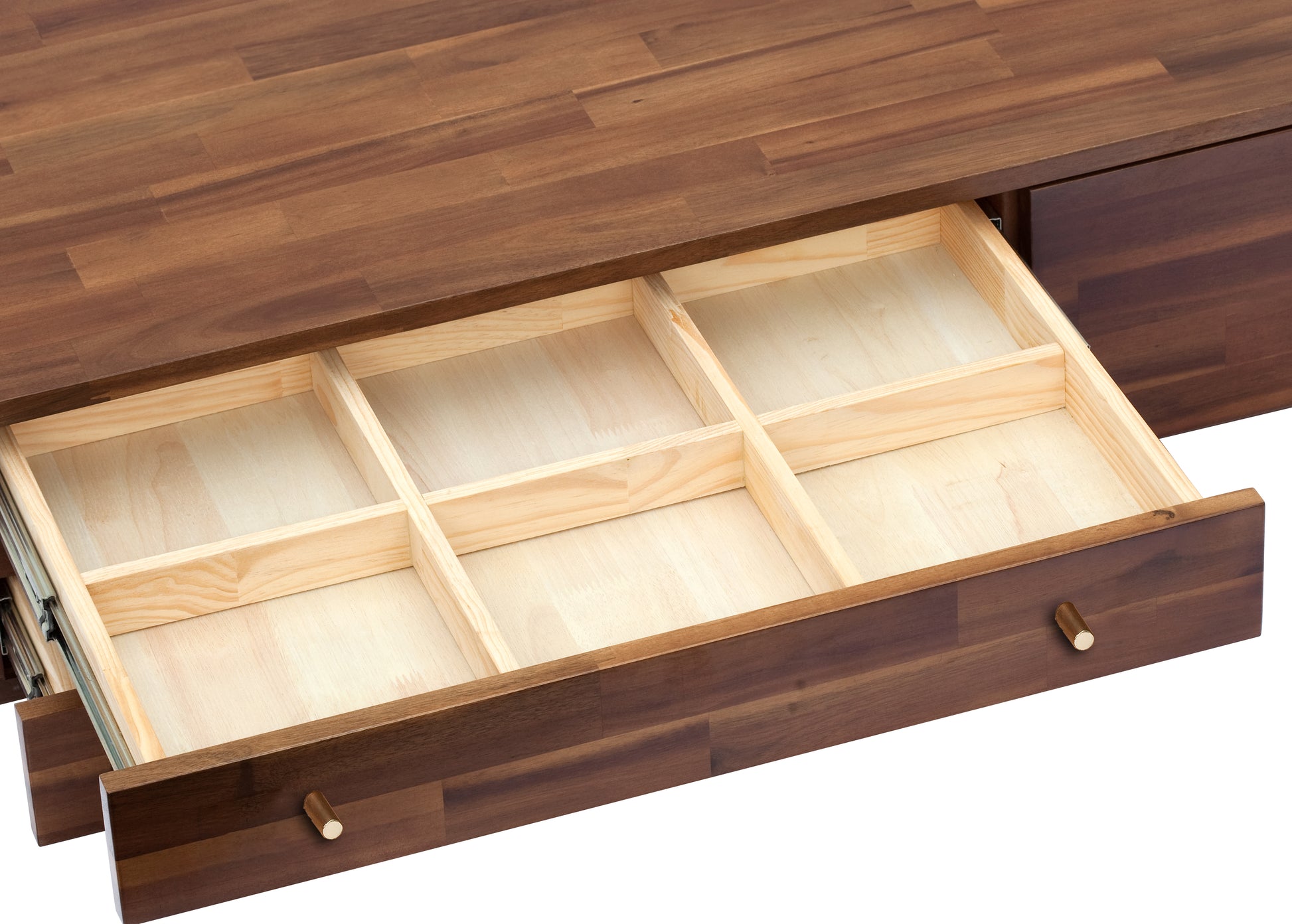 A no-nonsense vanity featuring a solid acacia wood body and black powder coated legs with gold tubes at their feet. There are three drawers - two on the left with the top drawer having compartments, and a third larger drawer on the right - for ample storage of knickknacks.