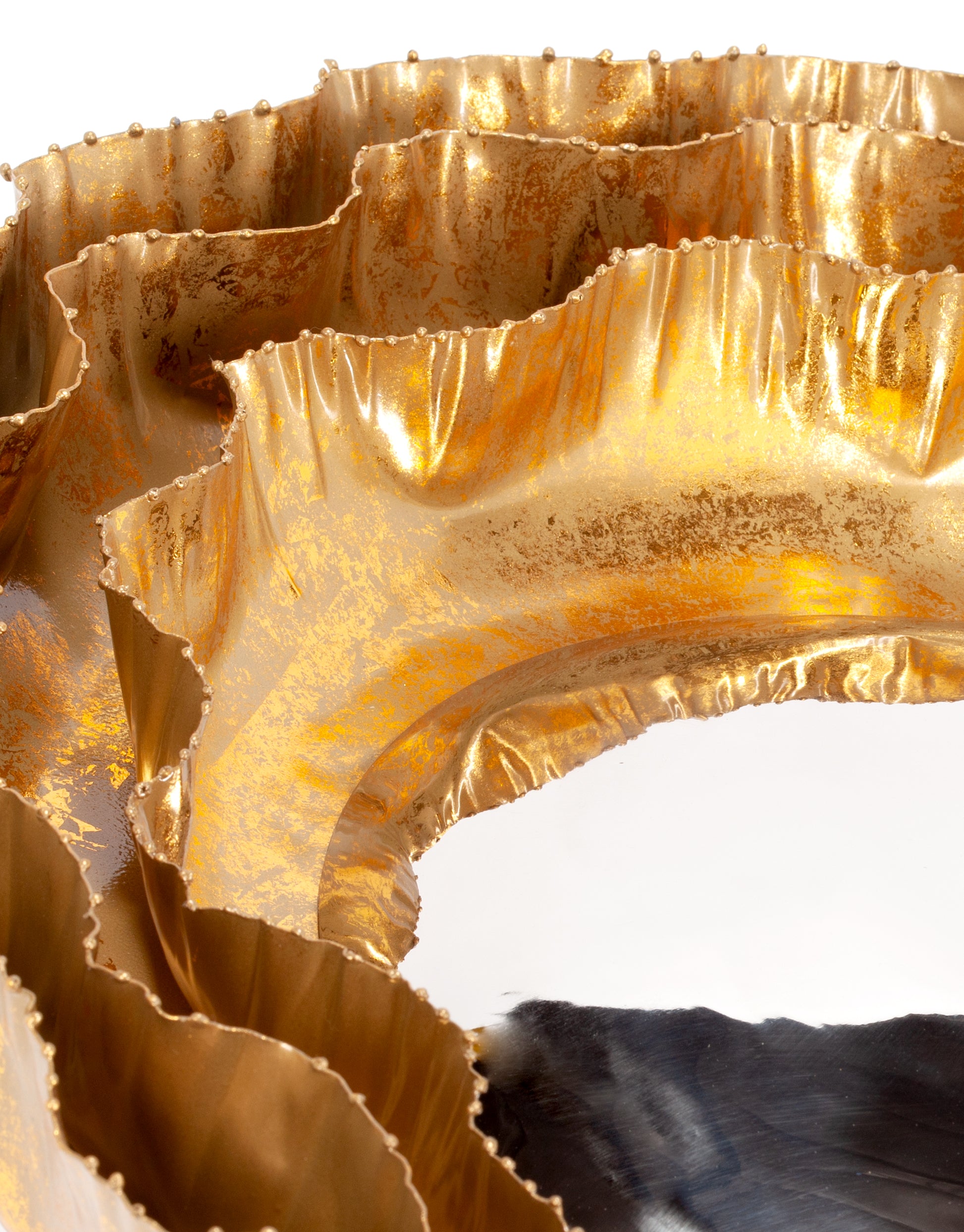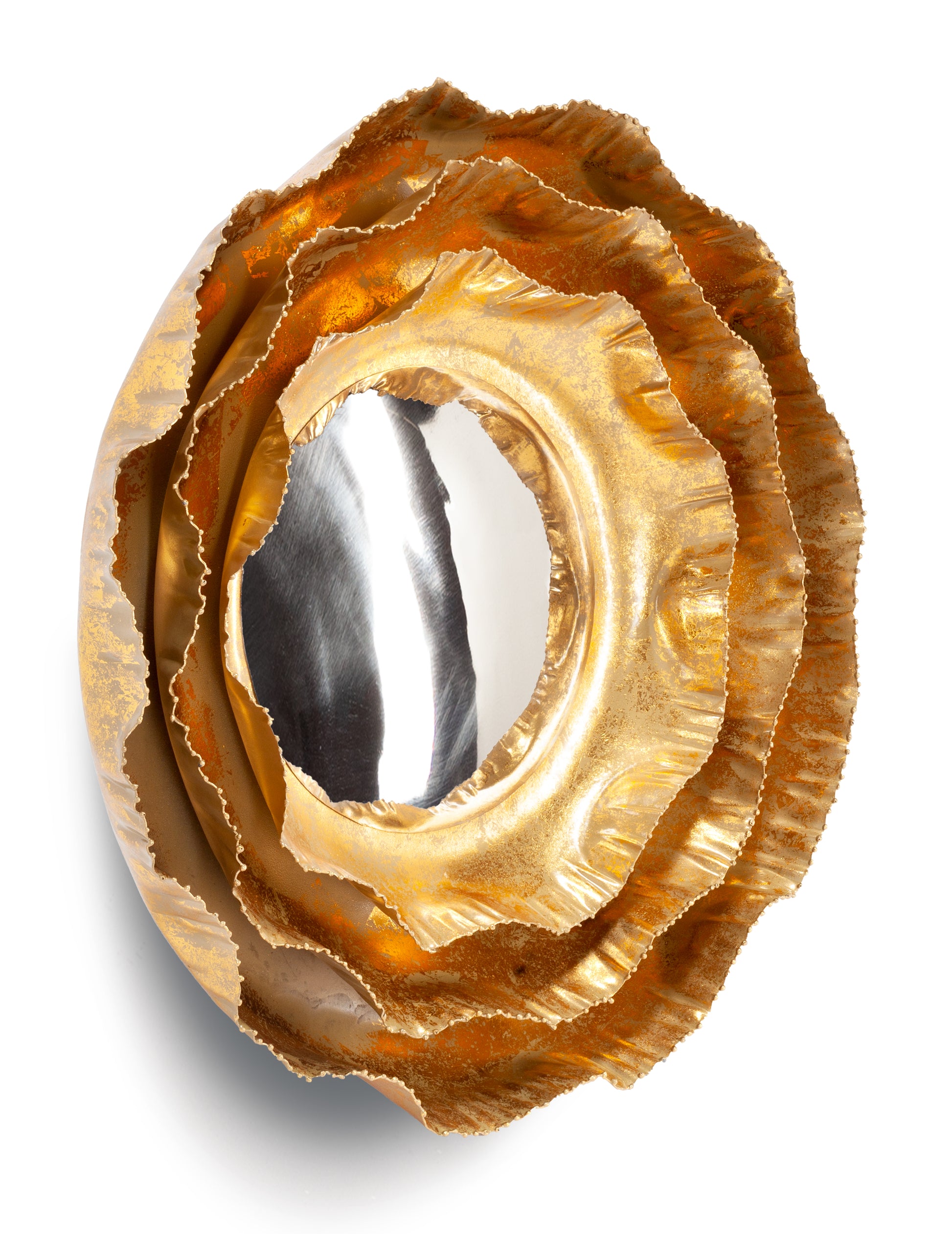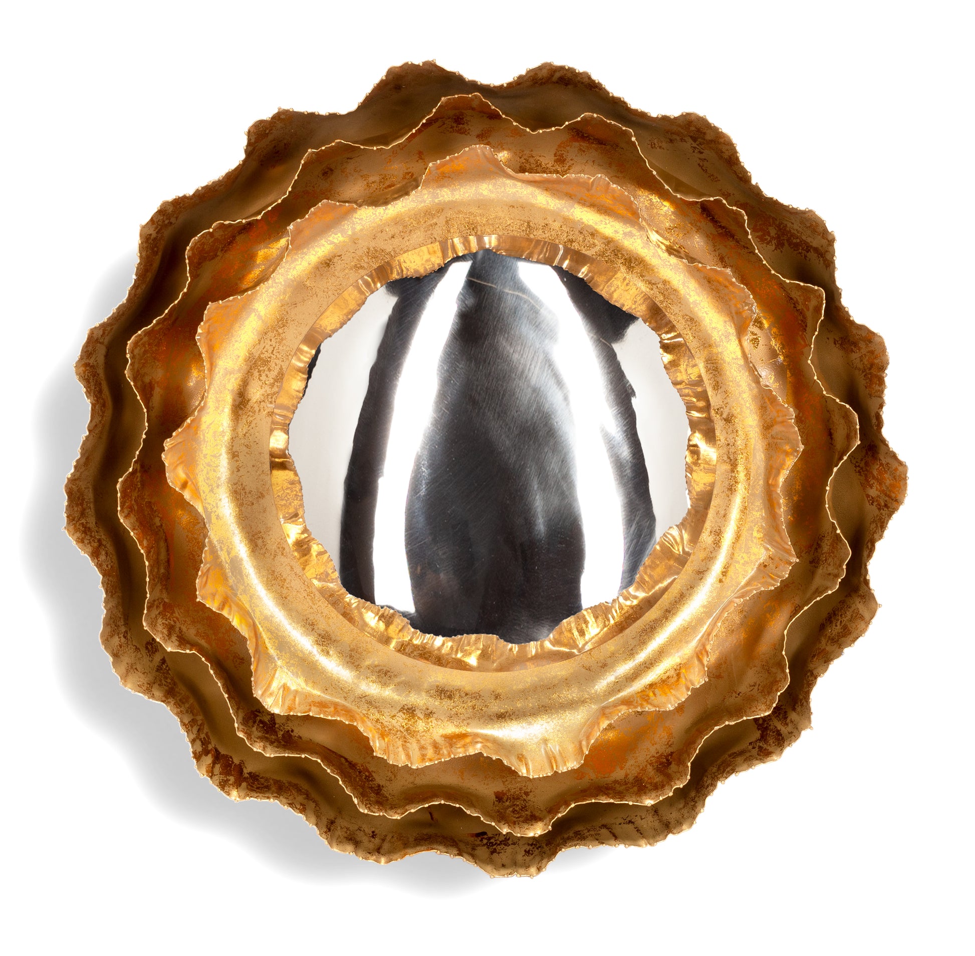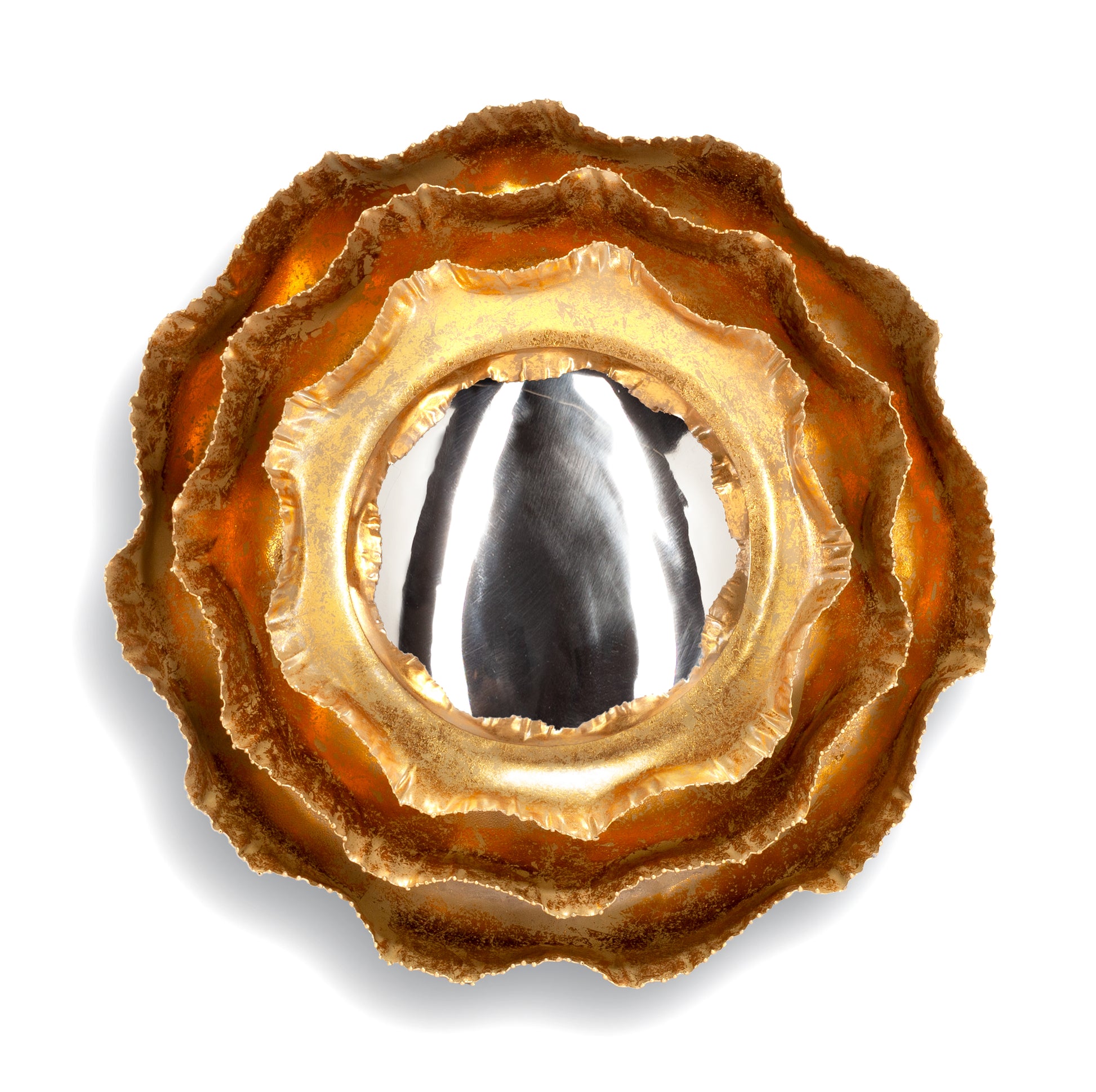 This handcrafted wall decor is a stunning metal wallflower in a gold and silver color. This captivating creation brings a bright and lively atmosphere to any room.