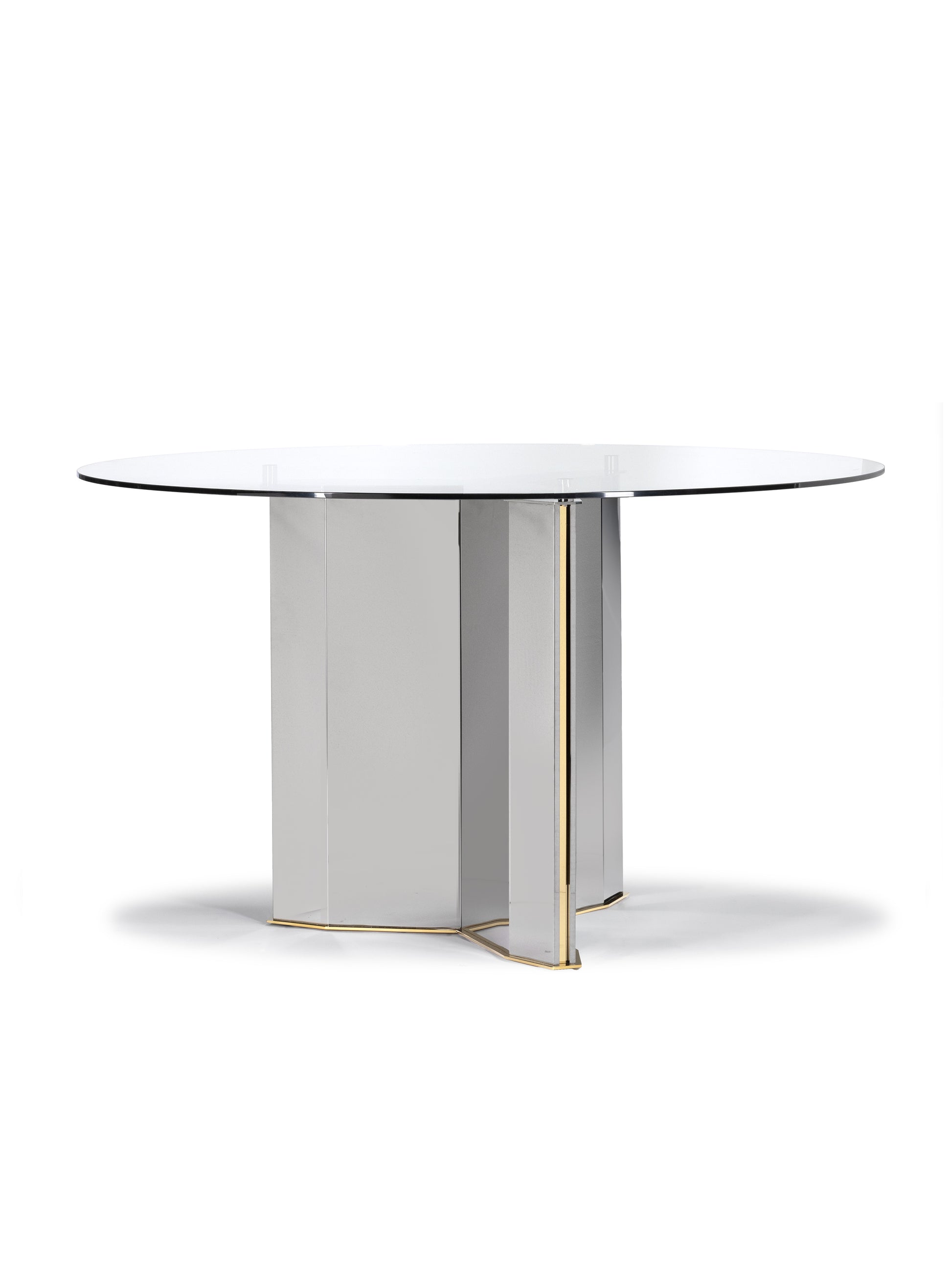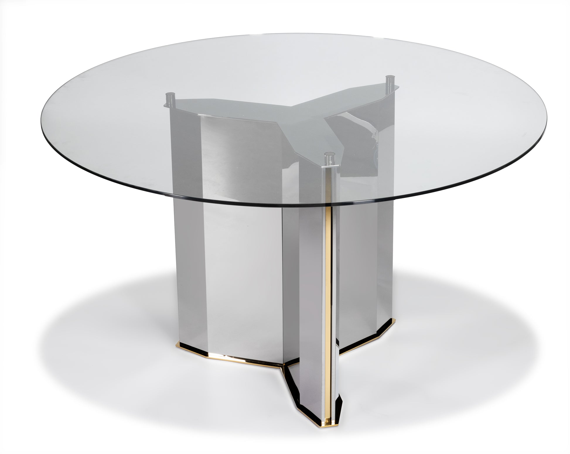 The Trio dining table captivates with its distinctive design, The striking contrast between black stainless steel and gold trim creates a captivating visual effect, while the glass top offers a clear view of the uniquely designed legs. More than just a functional piece, this table adds architectural interest and sophistication to your home.