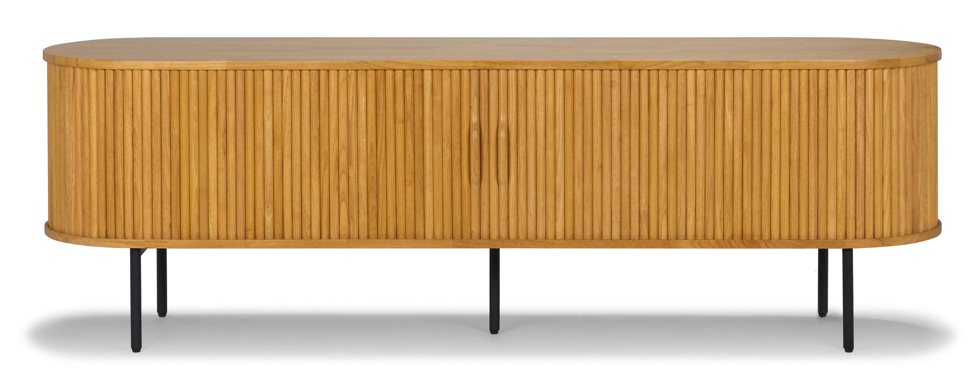 The Windsor TV Stand offers a fresh, new decor to liven up your living room! Its unique stadium design evokes a sense of modernity while its segmented wood panel design contrasts this with an old-fashioned cabin-sequel feel. The front panels open apart to be folded into the curved edges of the stand revealing 4 main large shelves for storing living room necessities.